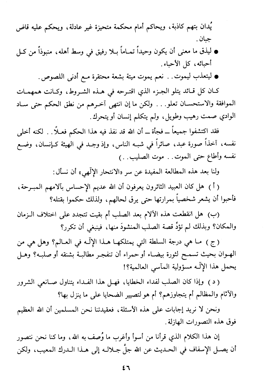 د ـ وإذا كان الصلب لفداء الخطايا، فهل هذا الفداء يتناول صانعى الشرور والآثام والمظالم أم يتجاوزهم؟ أم هو لتصبر الضحايا على ما ينزل بها؟