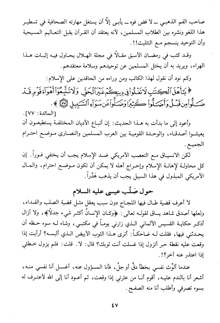 وكم نود أن نقول لهذا الكاتب ومن وراءه من الحاقدين على الإسلام: " يا أهل الكتاب لا تغلوا فى دينكم غير الحق ولا تتبعوا أهواء قوم قد ضلوا من قبل وأضلوا كثيراً وضلوا عن سواء السبيل " (المائدة: 77)