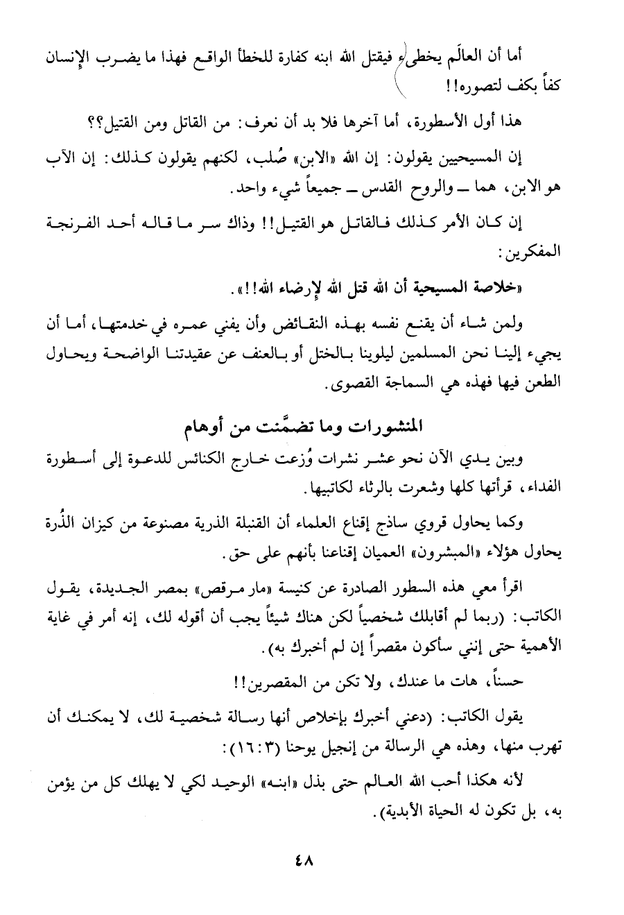 وبين يدى الآن نحو عشر نشرات وزعت خارج الكنائس للدعوة إلى أسطورة الفداء، قرأتها كلها وشعرت بالرثاء لكاتبيها.
