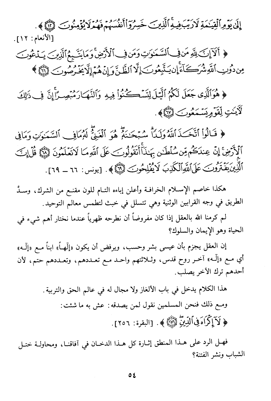 ومع ذلك فنحن المسلمين نقول لمن يصدقه: عش به ما شئت " لا إكراه فى الدين " (البقرة: 256) فهل الرد على هذا المنطق إثارة كل هذا الدخان فى آفاقنا، ومحاولة ختل الشباب ونشر الفتنة؟