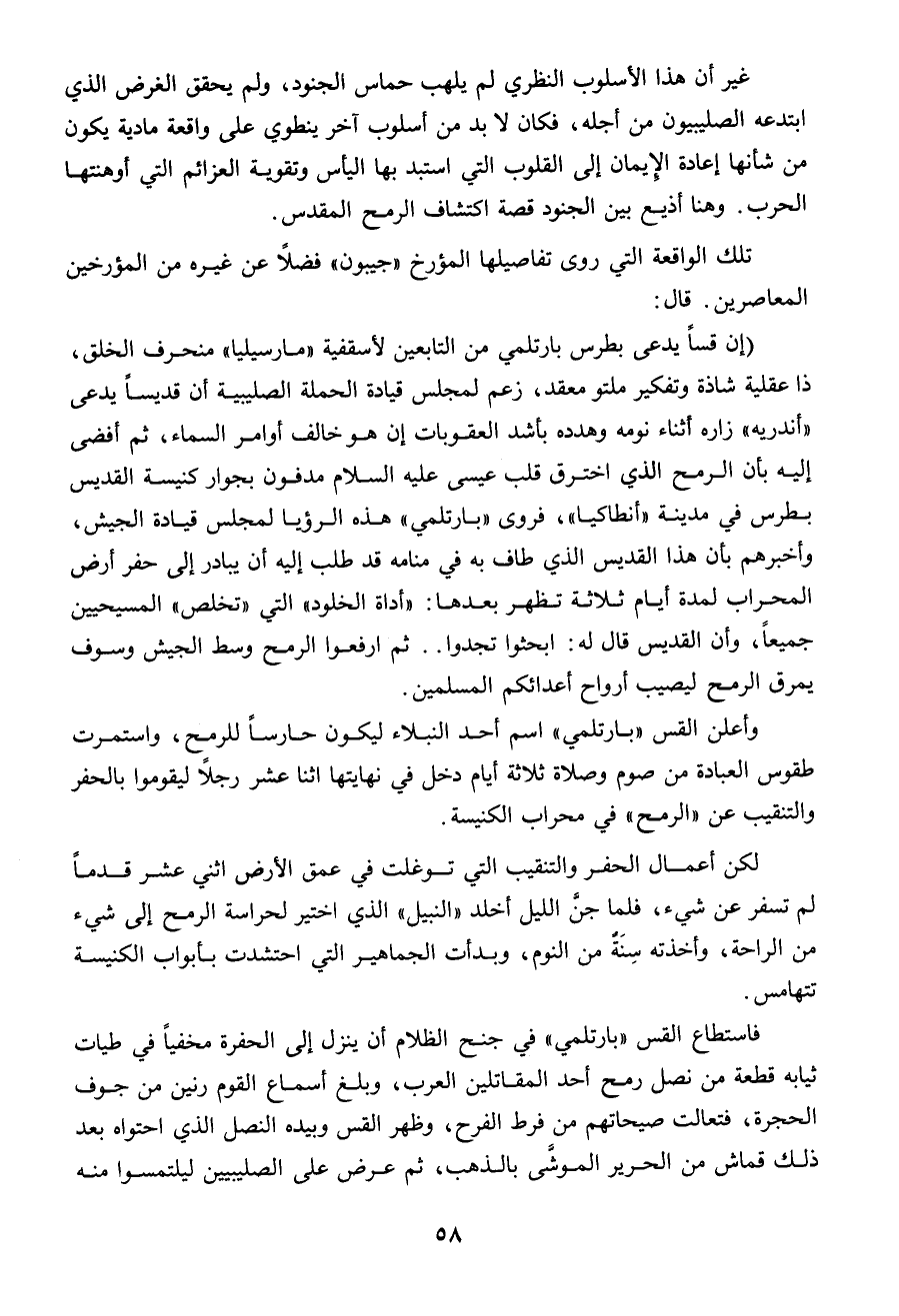 " فاستطاع القس " بارتلمى " فى جنح الظلام أن ينزل إلى الحفرة، مخفياً فى طيات ثيابه قطعة من نصل رمح أحد المقاتلين العرب، وبلغ أسماع القوم رنين من جوف الحجرة، فتعالت صيحاتهم من فرط الفرح، وظهر القس وبيده النصل الذى احتواه بعد ذلك قماش من الحرير الموشى بالذهب، ثم عرض على الصليبيين ليلتمسوا منه