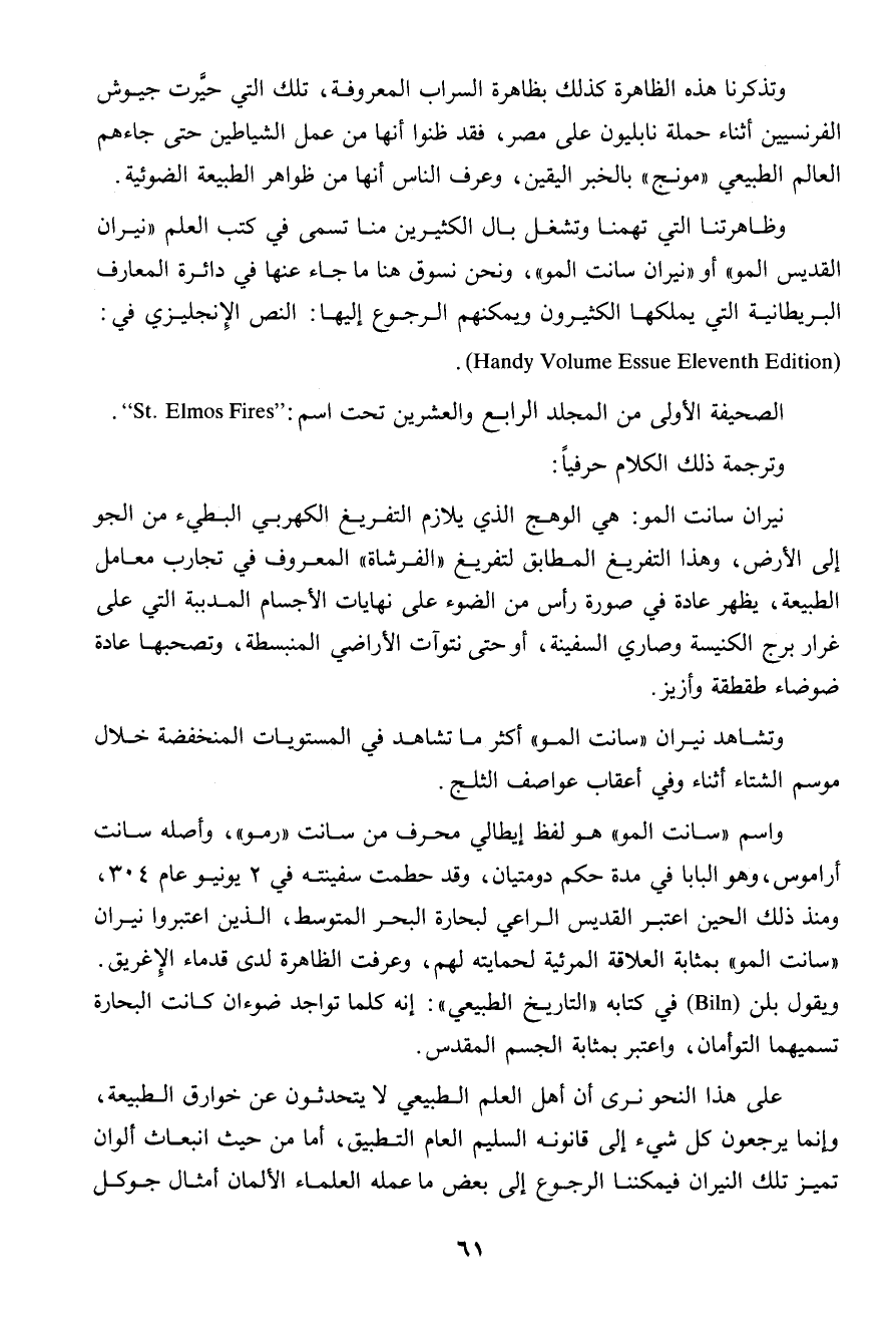 " وظاهرتنا التى تهمنا وتشغل بال الكثيرين منا تسمى فى كتب العلم " نيران القديس المو " أو " نيران سانت المو "، ونحن نسوق هنا ما جاء عنها فى دائرة المعارف البريطانية التى يملكها الكثيرون ويمكنهم الرجوع إليها: النص الإنجليزى فى: Handy Volume Essue Eleventh Edition الصحيفة الأولى من المجلد الرابع والعشرين تحت اسم: St. Elms Firs.. وترجمة ذلك الكلام حرفياً:..