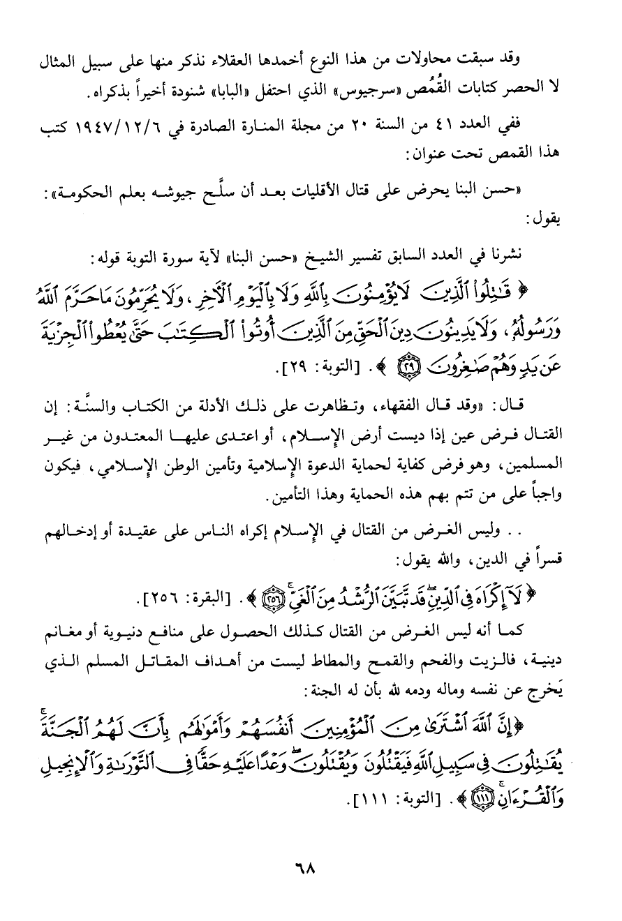 " نشرنا فى العدد السابق تفسير الشيخ " حسن البنا " لآية سورة التوبة قوله: " قاتلوا الذين لا يؤمنون بالله ولا باليوم الآخر ولا يحرمون ما حرم الله ورسوله ولا يدينون دين الحق من الذين أوتوا الكتاب حتى يعطوا الجزية عن يد وهم صاغرون " (التوبة: 29) ..
