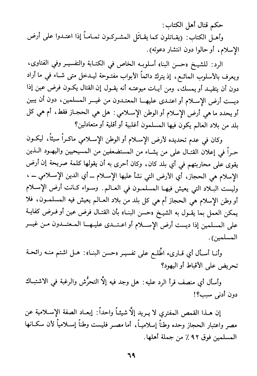 " وكان فى عدم تحديده لأرض الإسلام أو الوطن الإسلامى ماكراً سيئاً؛ ليكون حراً فى إعلان القتال على من يشاء من المستضعفين من المسيحيين واليهود الذين يقوى على محاربتهم فى أى بلد كان، وكان أحرى به أن يقولها كلمة صريحة أن أرض الإسلام هى الحجاز، أى الأرض التى نشأ عليها الإسلام ـ أى الدين الإسلامى ـ وليست البلاد التى يعيش فيها المسلمون فى العالم. وسواء كانت أرض الإسلام أو وطن الإسلام هى الحجاز أم هى كل بلد من بلاد العالم يعيش فيه المسلمون، فلا يمكن العمل بما يقول به الشيخ (حسن البنا) بأن القتال فرض عين أو فرض كفاية على المسلمين إذا ديست أرض الإسلام أو اعتدى عليها المعتدون من غير المسلمين ".