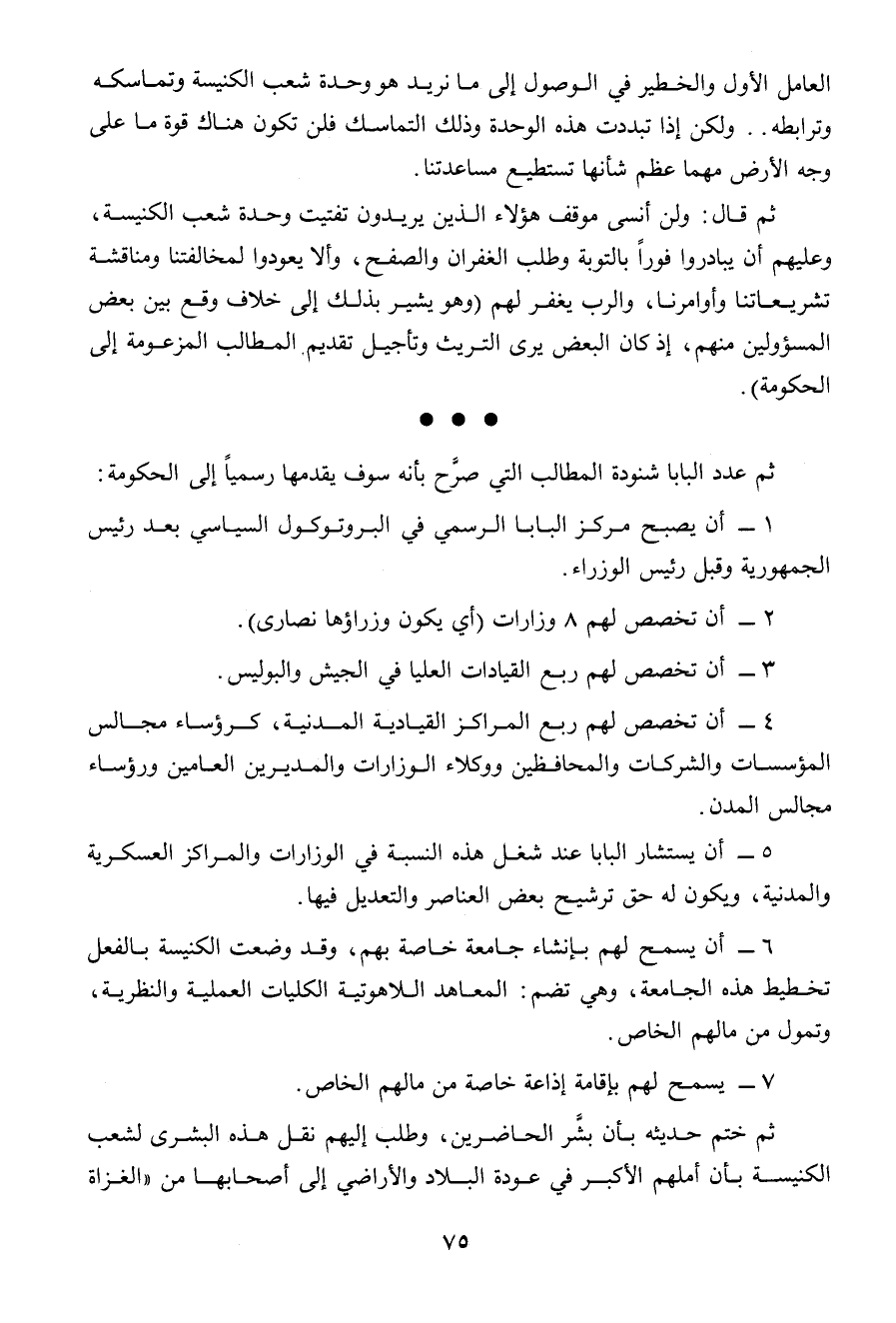 " ثم عدد البابا شنودة المطالب التي صرح بها بأنه سوف يقدمها رسمياً إلى الحكومة:..
