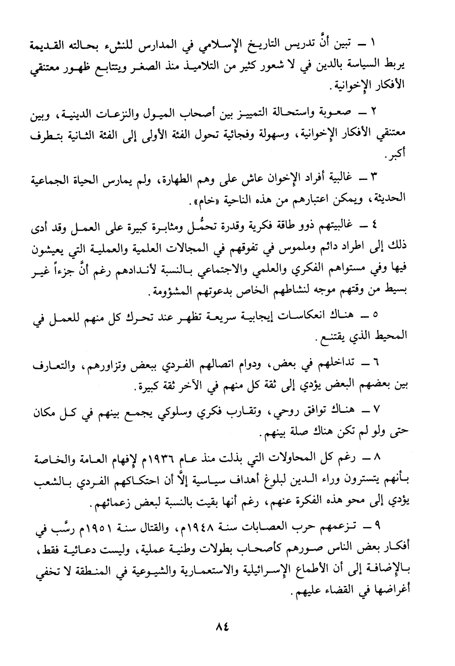 8 ـ رغم كل المحاولات التى بذلت منذ عام 1936 لإفهام العامة والخاصة بأنهم يتسترون وراء الدين لبلوغ أهداف سياسية إلا أن احتكاكهم الفردى بالشعب يؤدى إلى محو هذه الفكرة عنهم، رغم أنها بقيت بالنسبة لبعض زعمائهم.