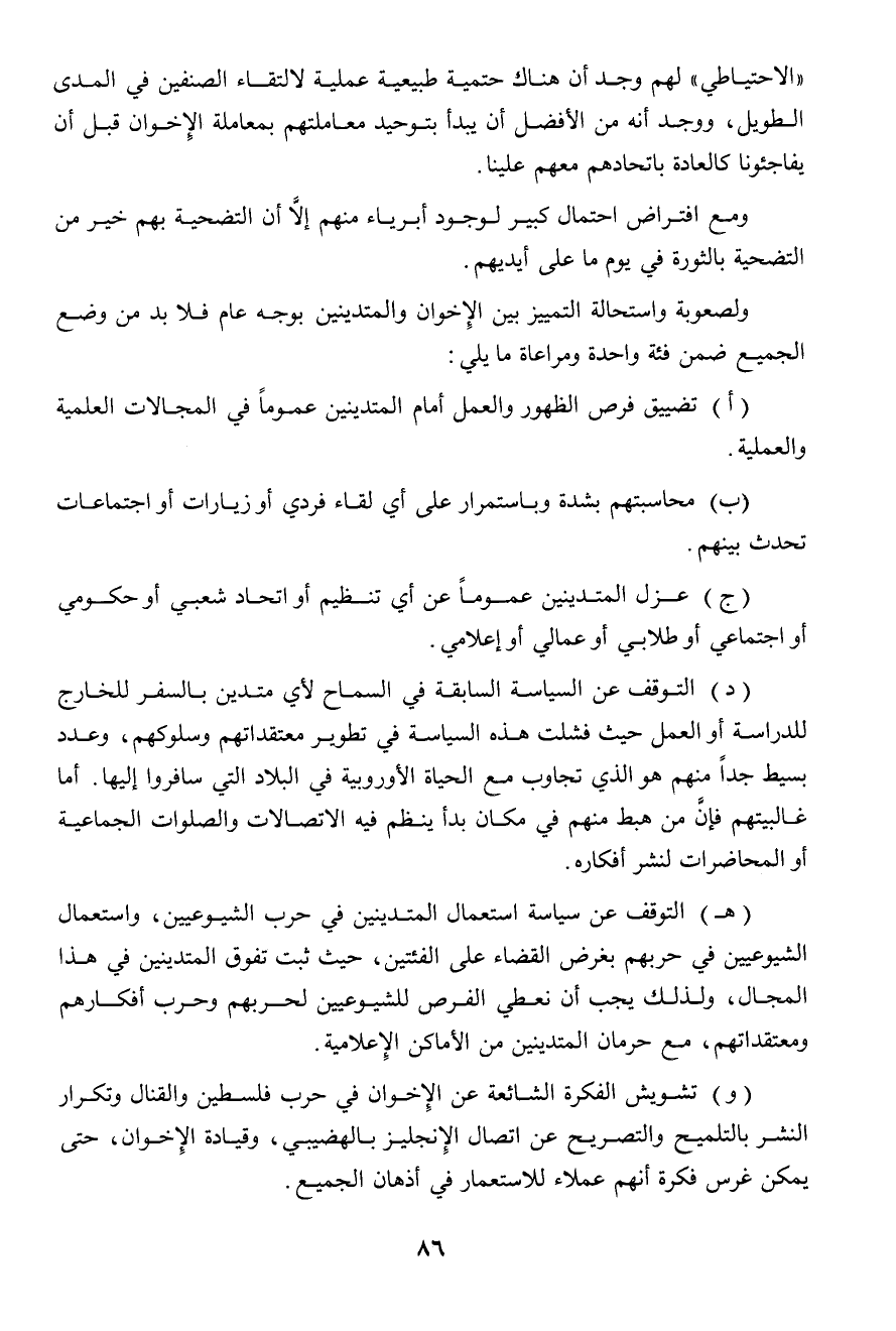 هـ ـ التوقف عن سياسة استعمال المتدينين فى حرب الشيوعيين واستعمال الشيوعيين فى حربهم بغرض القضاء على الفئتين، حيث ثبت تفوق المتدينين فى هذا المجال، ولذلك يجب أن نعطى الفرص للشيوعيين لحربهم وحرب أفكارهم ومعتقداتهم، مع حرمان المتدينين من الأماكن الإعلامية.