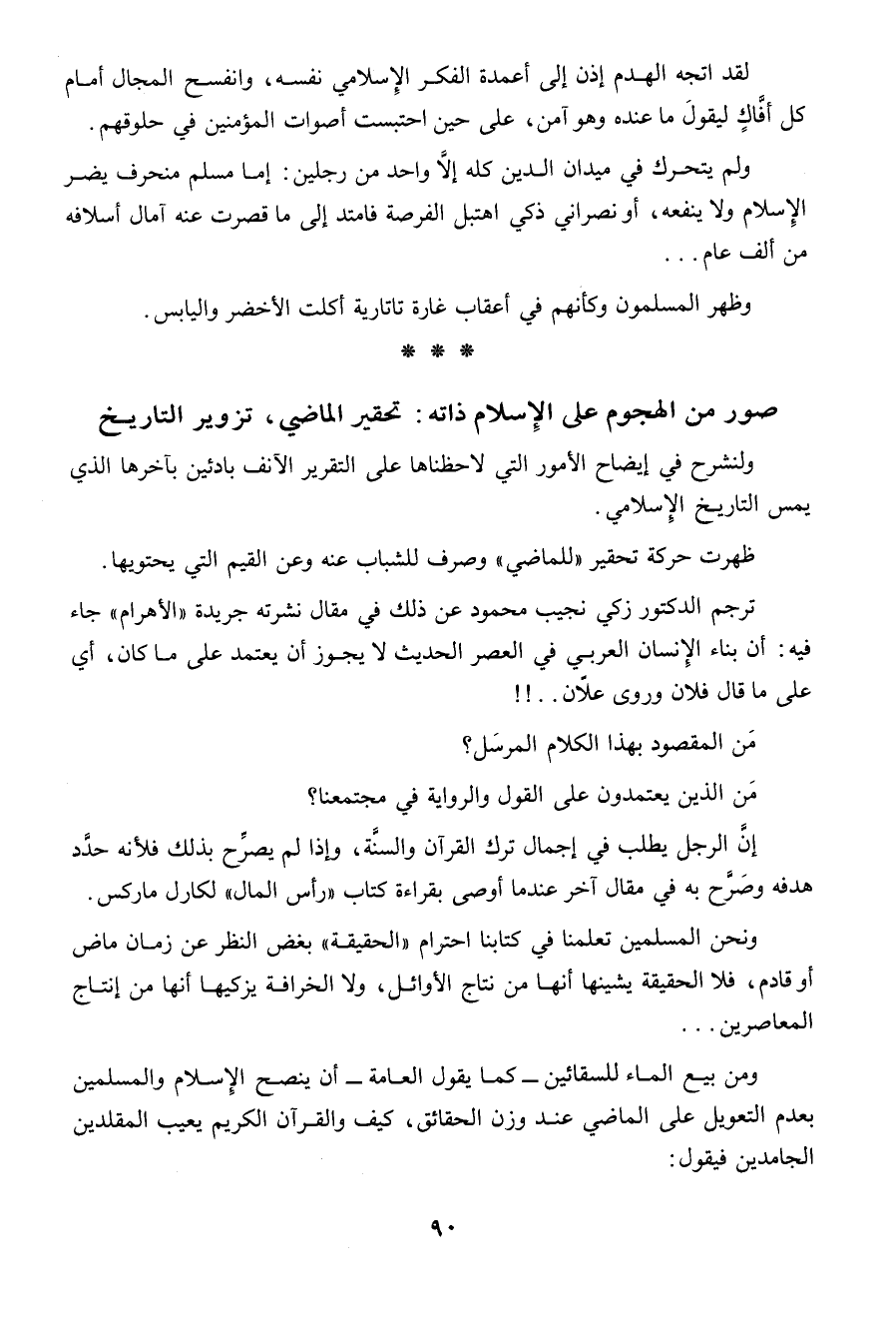 إن الرجل يطلب فى إجمال ترك القرآن والسنة، وإذا لم يصرح بذلك فلأنه حدد هدفه وصرح به فى مقال آخر عندما أوصى بقراءة كتاب " رأس المال " لكارل ماركس.