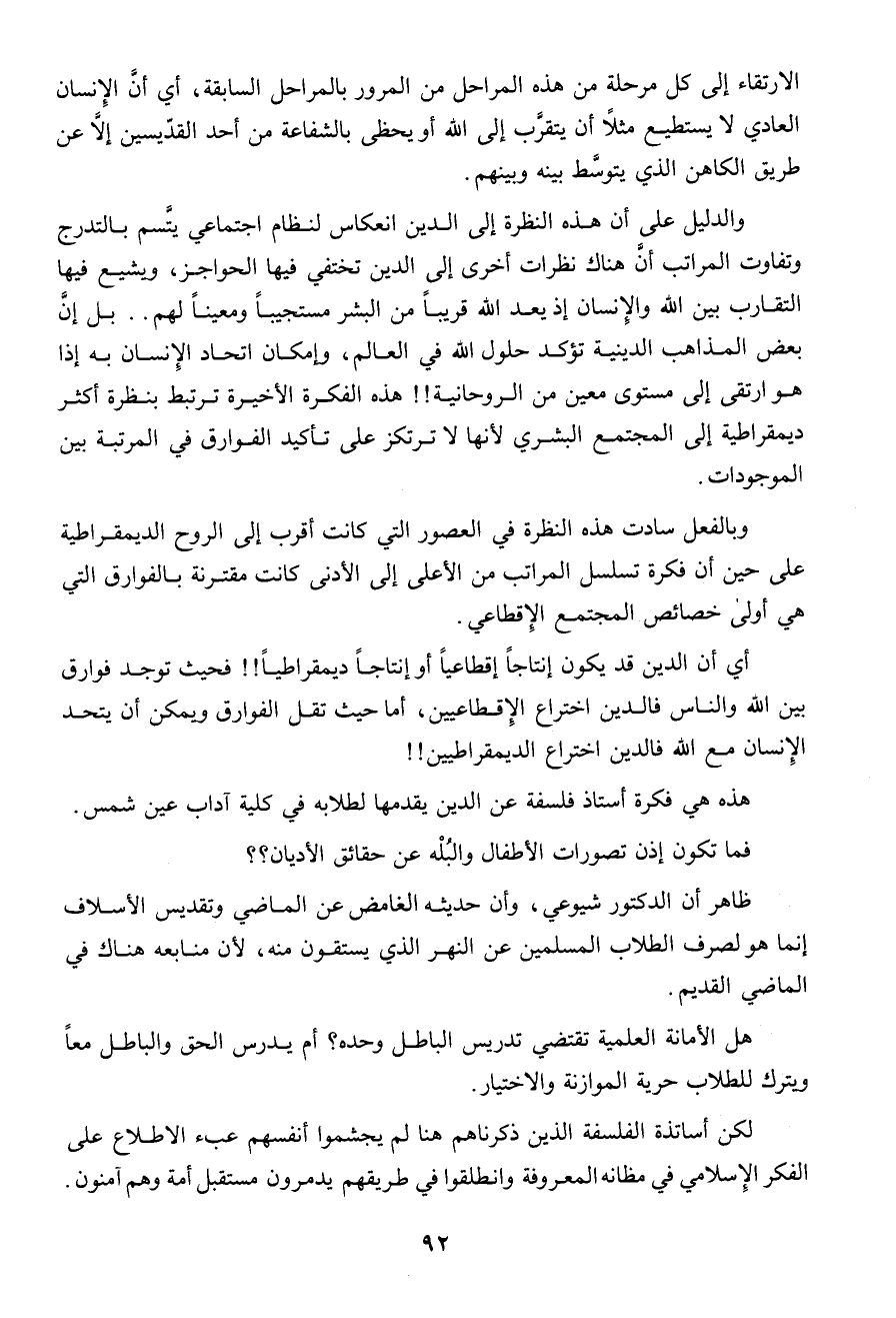 " والدليل على أن هذه النظرة إلى الدين انعكاس لنظام اجتماعى يتسم بالديمقراطية على حين أن فكرة تسلسل المراتب من الأعلى إلى الأدنى كانت البشرى لأنها لا ترتكز على تأكيد الفوارق فى المرتبة بين الموجودات.. وبالفعل سادت هذه النظرة فى العصور التى كانت أقرب إلى روح مقترنة بالفوارق التى هى أولى خصائص المجتمع