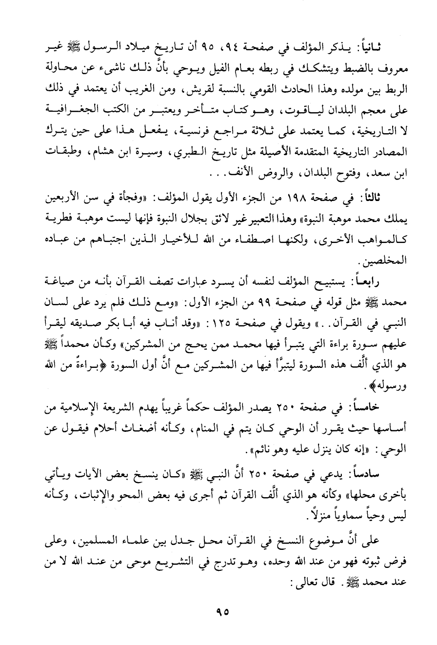 فى صفحة 198 من الجزء الأول يقول المؤلف: " وفجأة فى سن الأربعين يملك محمد موهبة النبوة " وهذا التعبير غير لائق بجلال النبوة، فإنها ليست موهبة فطرية كالمواهب الأخرى، ولكنها اصطفاء من الله للأخيار الذين اجتباهم من عباده المخلصين.