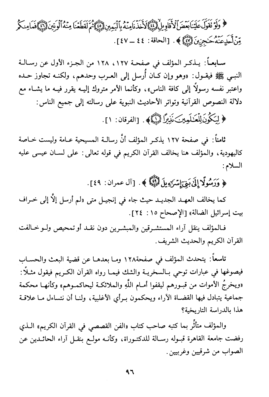 فى صفحة 127 يذكر المؤلف أن رسالة المسيحية عامة وليست خاصة كاليهودية، والمؤلف هنا يخالف القرآن الكريم فى قوله تعالى: على لسان عيسى عليه السلام " ورسولاً إلى بنى إسرائيل " (آل عمران: 49) كما يخالف العهد الجديد حيث جاء فى إنجيل متى " لم أرسل إلا إلى خراف بيت إسرائيل الضالة " (الاصحاح 15: 24) فالمؤلف ينقل آراء المستشرقين والمبشرين دون نقد أو تمحيص ولو خالفت القرآن الكريم والحديث الشريف.
