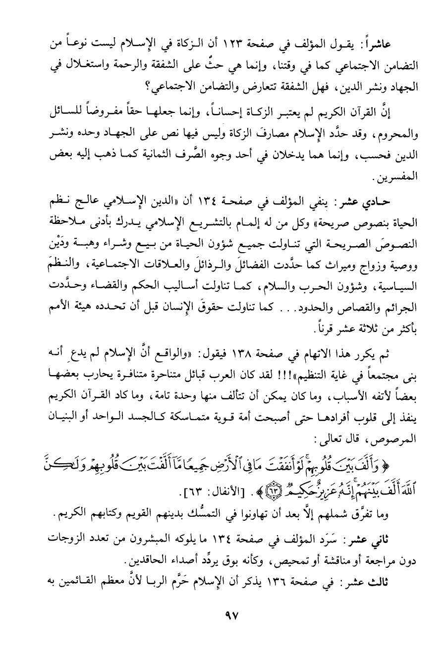 ثم يكرر هذا الاتهام فى صفحة 138 فيقول: " والواقع أن الإسلام لم يدع أنه بنى مجتمعاً فى غاية التنظيم "!!! لقد كان العرب قبائل متناحرة متنافرة يحارب بعضها بعضاً لأتفه الأسباب، وما كان يمكن أن تتألف منها وحدة تامة، وما كان القرآن الكريم ينفذ إلى قلوب أفرادها حتى أصبحت أمة قوية متماسكة كالجسد الواحد أو البنيان المرصوص، قال تعالى: " وألف بين قلوبهم لو أنفقت ما فى الأرض جميعاً ما ألفت بين قلوبهم ولكن الله ألف