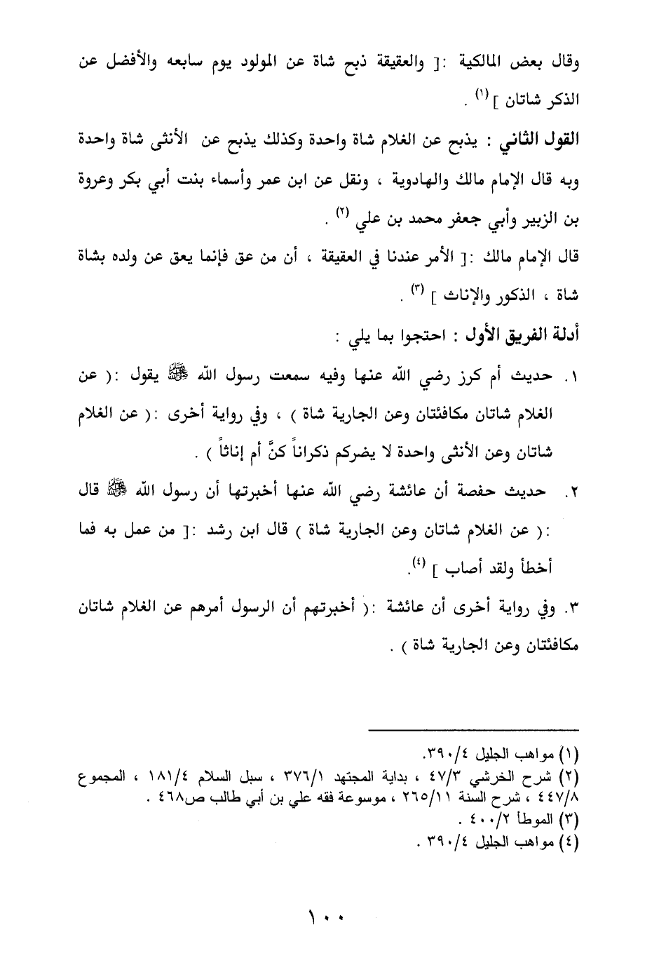 2. حديث حفصة أن عائشة رضي الله عنها أخبرتها أن رسول الله - صلى الله عليه وسلم - قال: (عن الغلام شاتان وعن الجارية شاة) قال ابن رشد: [من عمل به فما أخطأ ولقد أصاب] (¬4).