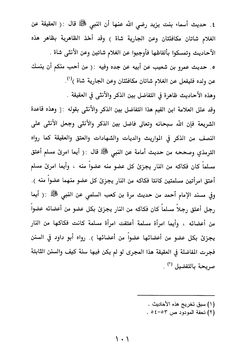 وقد علل العلامة ابن القيم هذا التفاضل بين الذكر والأنثى بقوله: [وهذه قاعدة الشريعة فإن الله سبحانه وتعالى فاضل بين الذكر والأنثى وجعل الأنثى على النصف من الذكر في المواريث والديات والشهادات والعتق والعقيقة كما رواه الترمذي وصححه من حديث أمامة عن النبي - صلى الله عليه وسلم - قال: (أيما امرئ مسلم أعتق مسلماً كان فكاكه من النار يجزئ كل عضو منه عضواً منه، وأيما امرئ مسلم أعتق امرأتين مسلمتين كانتا فكاكه من النار يجزئ كل عضو منهما عضواً منه). وفي مسند الإمام أحمد من حديث مرة بن كعب السلمي عن النبي - صلى الله عليه وسلم -: (أيما رجل أعتق رجلاً مسلماً كان فكاكه من النار يجزئ بكل عضو من أعضائه عضواً من أعضائه، وأيما امرأة مسلمة أعتقت امرأة مسلمة كانت فكاكها من النار يجزئ بكل عضو من أعضائها عضواً من أعضائها). رواه أبو داود في السنن فجرت المفاضلة في العقيقة هذا المجرى لو لم يكن فيها سنة كيف والسنن الثابتة صريحة بالتفضيل (¬2).