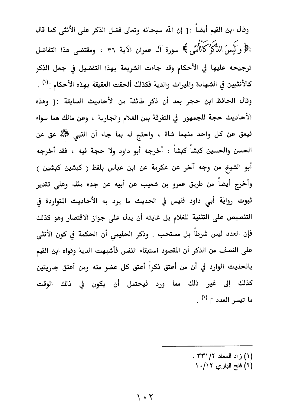 وقال ابن القيم أيضاً: [إن الله سبحانه وتعالى فضل الذكر على الأنثى كما قال: {و َلَيْسَ الذَّكَرُ كَالْأُنْثَى} سورة آل عمران الآية 36، ومقتضى هذا التفاضل ترجيحه عليها في الأحكام وقد جاءت الشريعة بهذا التفضيل في جعل الذكر كالأنثيين في الشهادة والميراث والدية فكذلك ألحقت العقيقة بهذه الأحكام] (¬1).