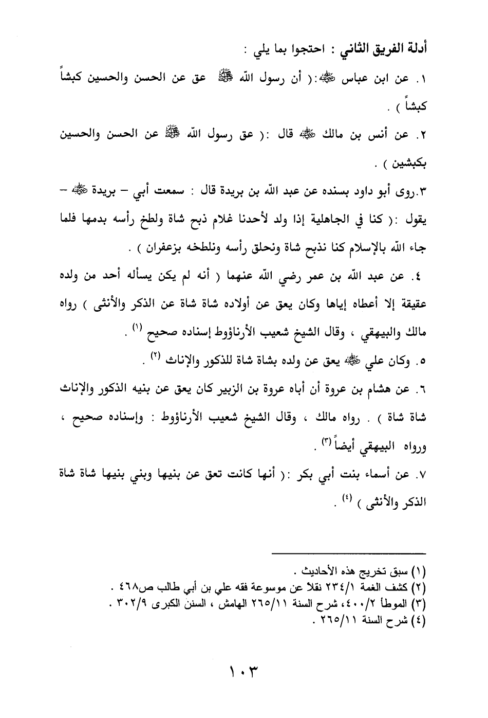6. عن هشام بن عروة أن أباه عروة بن الزبير كان يعق عن بنيه الذكور والإناث شاة شاة). رواه مالك، وقال الشيخ شعيب الأرناؤوط: وإسناده صحيح، ورواه البيهقي أيضاً (¬3).