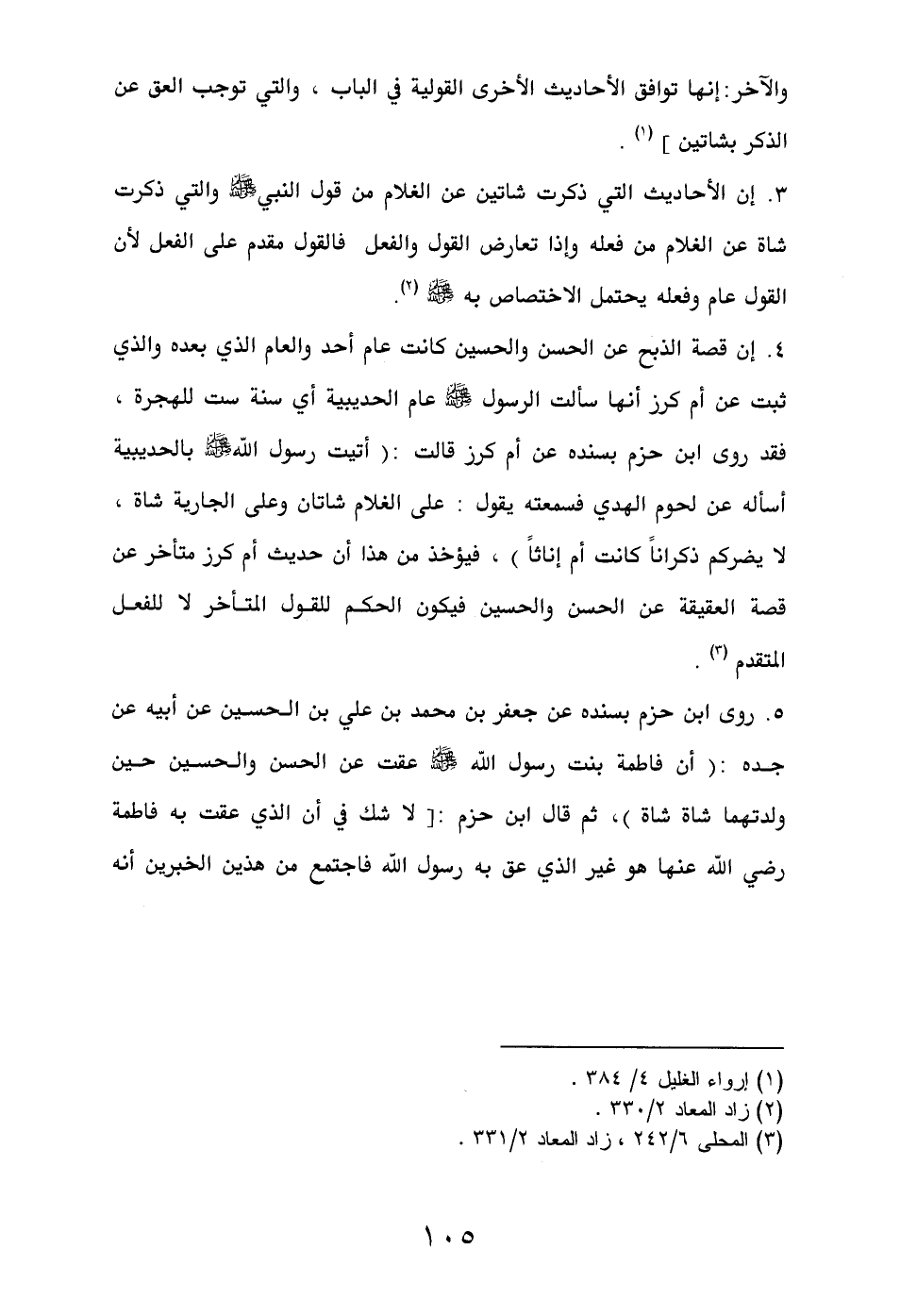 4. إن قصة الذبح عن الحسن والحسين كانت عام أحد والعام الذي بعده والذي ثبت عن أم كرز أنها سألت الرسول - صلى الله عليه وسلم - عام الحديبية أي سنة ست للهجرة، فقد روى ابن حزم بسنده عن أم كرز قالت: (أتيت رسول الله - صلى الله عليه وسلم - بالحديبية أسأله عن لحوم الهدي فسمعته يقول: على الغلام شاتان وعلى الجارية شاة، لا يضركم ذكراناً كانت أم إناثاً)، فيؤخذ من هذا أن حديث أم كرز متأخر عن قصة العقيقة عن الحسن والحسين فيكون الحكم للقول المتأخر لا للفعل المتقدم (¬3).