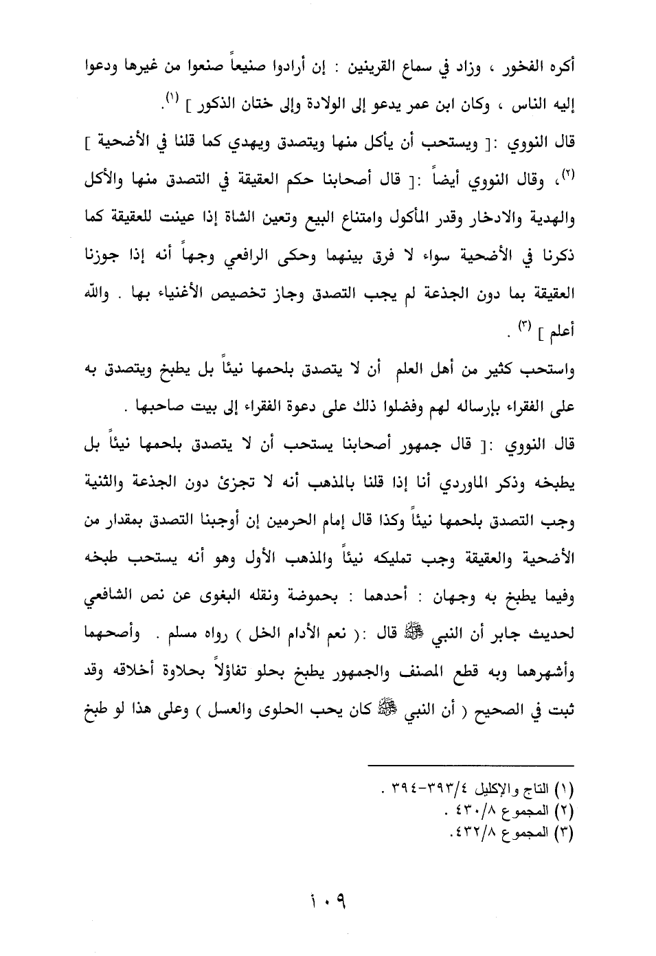 واستحب كثير من أهل العلم أن لا يتصدق بلحمها نيئاً بل يطبخ ويتصدق به على الفقراء بإرساله لهم وفضلوا ذلك على دعوة الفقراء إلى بيت صاحبها.
