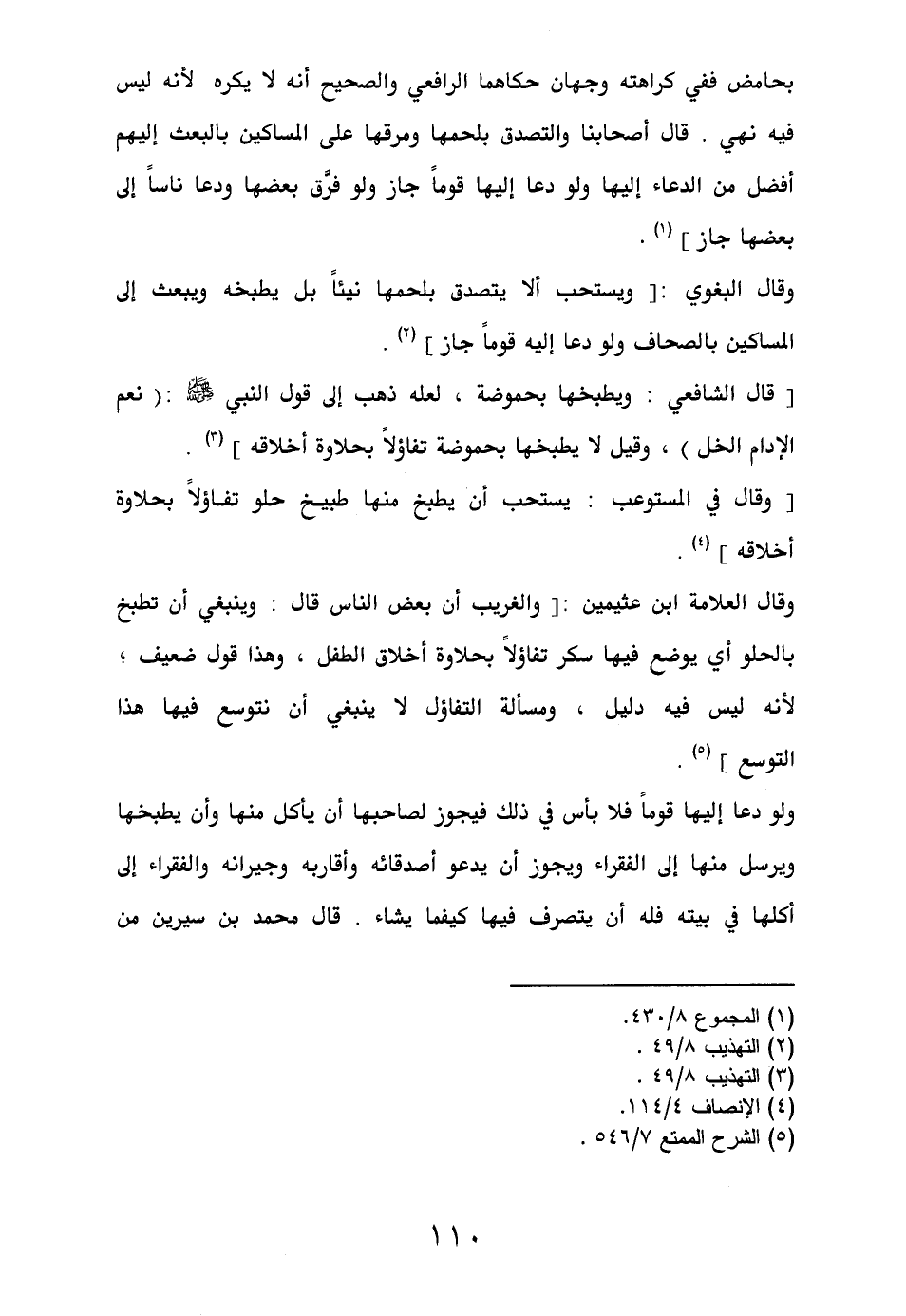 وقال العلامة ابن عثيمين: [والغريب أن بعض الناس قال: وينبغي أن تطبخ بالحلو أي يوضع فيها سكر تفاؤلاً بحلاوة أخلاق الطفل، وهذا قول ضعيف؛ لأنه ليس فيه دليل، ومسألة التفاؤل لا ينبغي أن نتوسع فيها هذا ... التوسع] (¬5).
