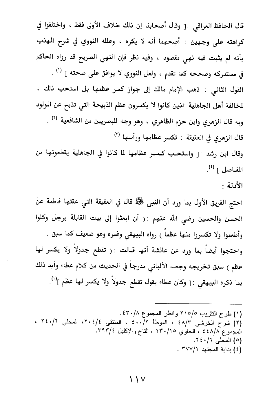 القول الثاني: ذهب الإمام مالك إلى جواز كسر عظمها بل استحب ذلك، لمخالفة أهل الجاهلية الذين كانوا لا يكسرون عظم الذبيحة التي تذبح عن المولود وبه قال الزهري وابن حزم الظاهري، وهو وجه للبصريين من الشافعية (¬2).