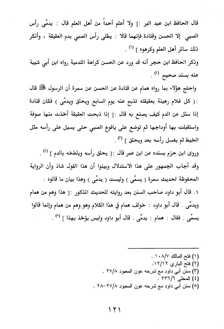 واحتج هؤلاء بما رواه همام عن قتادة عن الحسن عن سمرة أن الرسول - صلى الله عليه وسلم - قال: (كل غلام رهينة بعقيقته تذبح عنه يوم السابع ويحلق ويدمَّى) فكان قتادة إذا سئل عن الدم كيف يصنع به قال: [إذا ذبحت العقيقة أخذت منها صوفة واستقبلت بها أوداجها ثم توضع على يافوخ الصبي حتى يسيل على رأسه مثل الخيط ثم يغسل رأسه بعد ويحلق] (¬3).