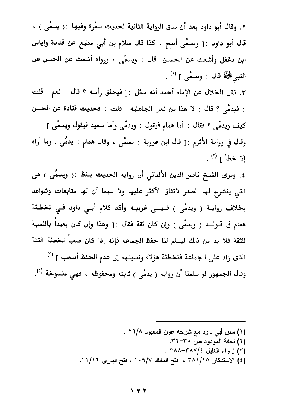 4. ويرى الشيخ ناصر الدين الألباني أن رواية الحديث بلفظ: (ويسمَّى) هي التي ينشرح لها الصدر لاتفاق الأكثر عليها ولا سيما أن لها متابعات وشواهد بخلاف رواية (ويدمَّى) فهي غريبة وأكد كلام أبي داود في تخطئة همام في قوله (ويدمَّى) وإن كان ثقة فقال: [وهذا وإن كان بعيداً بالنسبة للثقة فلا بد من ذلك ليسلم لنا حفظ الجماعة فإنه إذا كان صعباً تخطئة الثقة الذي زاد على الجماعة فتخطئة هؤلاء ونسبتهم إلى عدم الحفظ أصعب] (¬3).