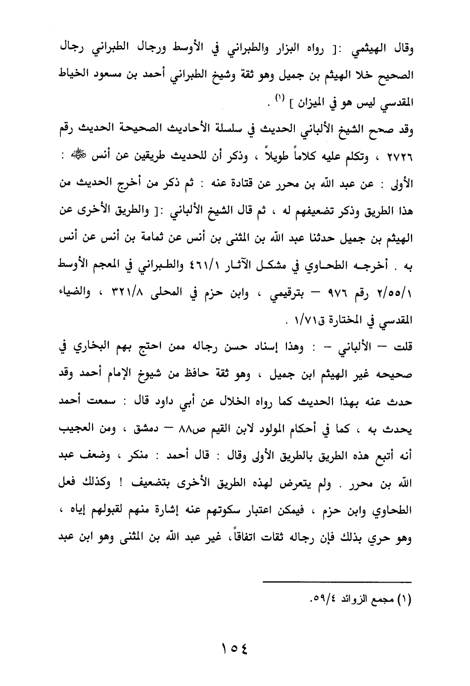 قلت – الألباني -: وهذا إسناد حسن رجاله ممن احتج بهم البخاري في صحيحه غير الهيثم بن جميل، وهو ثقة حافظ من شيوخ الإمام أحمد وقد حدث عنه بهذا الحديث كما رواه الخلال عن أبي داود قال: سمعت أحمد يحدث به، كما في أحكام المولود لابن القيم ص88 – دمشق، ومن العجيب أنه أتبع هذه الطريق بالطريق الأولى وقال: قال أحمد: منكر، وضعف عبد الله بن محرر. ولم يتعرض لهذه الطريق الأخرى بتضعيف! وكذلك فعل الطحاوي وابن حزم، فيمكن اعتبار سكوتهم عنه إشارة منهم لقبولهم إياه، وهو حري بذلك فإن رجاله ثقات اتفاقاً، غير عبد الله بن المثنى وهو ابن عبد