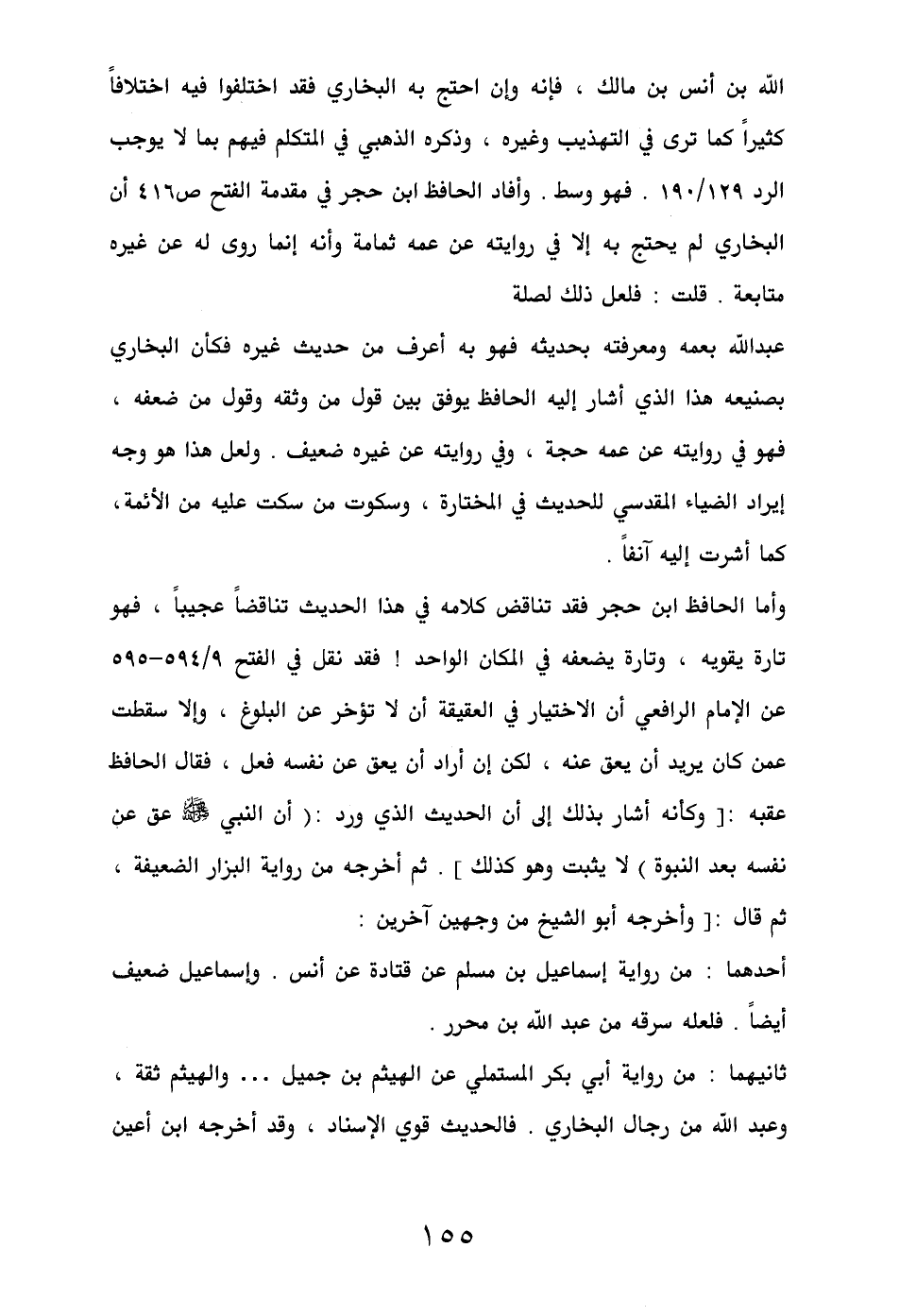 الله بن أنس بن مالك، فإنه وإن احتج به البخاري فقد اختلفوا فيه اختلافاً كثيراً كما ترى في التهذيب وغيره، وذكره الذهبي في المتكلم فيهم بما لا يوجب الرد 129/ 190. فهو وسط. وأفاد الحافظ ابن حجر في مقدمة الفتح ص416 أن البخاري لم يحتج به إلا في روايته عن عمه ثمامة وأنه إنما روى له عن غيره متابعة. قلت: فلعل ذلك لصلة عبدالله بعمه ومعرفته بحديثه فهو به أعرف من حديث غيره فكأن البخاري بصنيعه هذا الذي أشار إليه الحافظ يوفق بين قول من وثقه وقول من ضعفه، فهو في روايته عن عمه حجة، وفي روايته عن غيره ضعيف. ولعل هذا هو وجه إيراد الضياء المقدسي للحديث في المختارة، وسكوت من سكت عليه من الأئمة، كما أشرت إليه آنفاً.