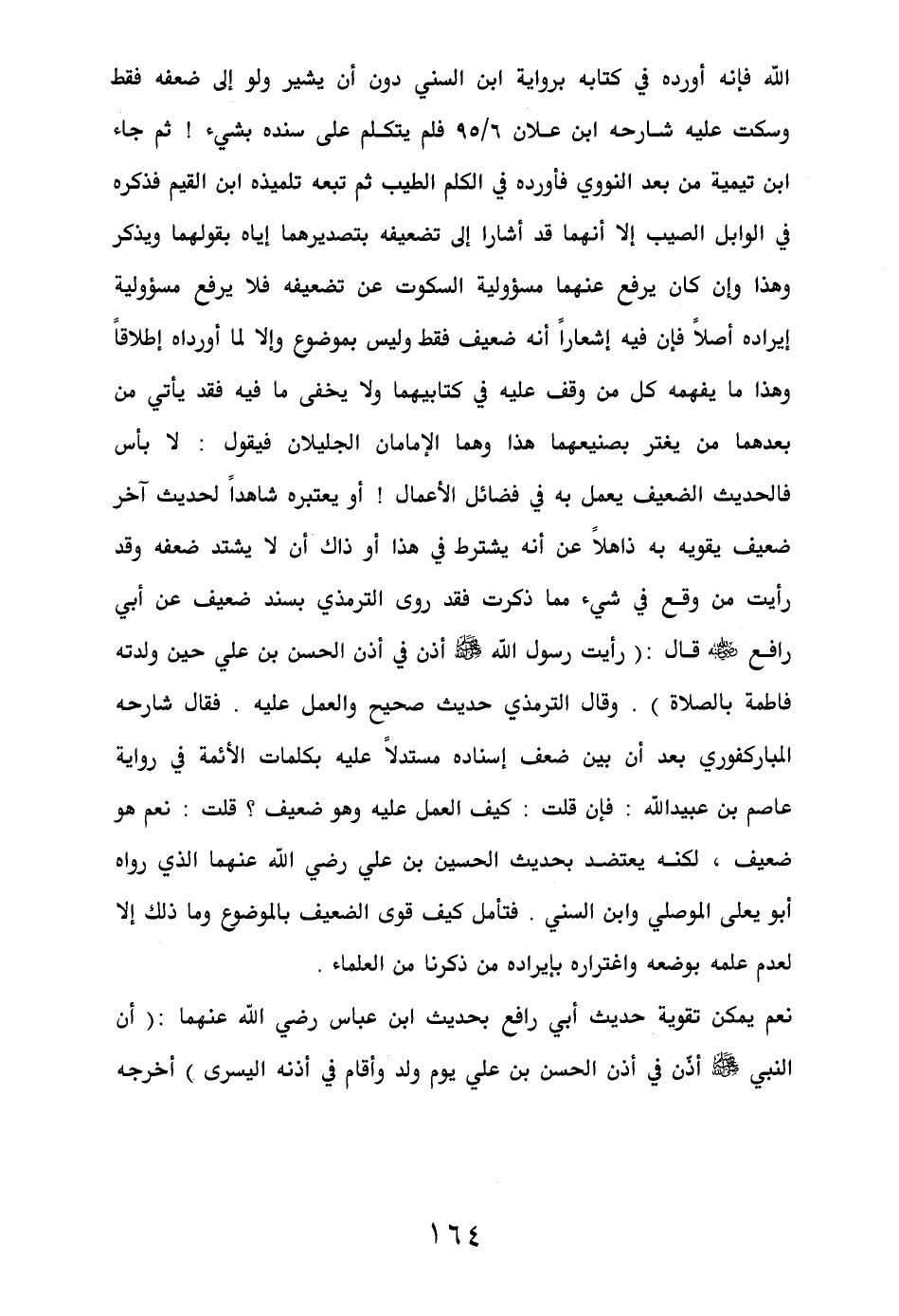 الله فإنه أورده في كتابه برواية ابن السني دون أن يشير ولو إلى ضعفه فقط وسكت عليه شارحه ابن علان 6/ 95 فلم يتكلم على سنده بشيء! ثم جاء ابن تيمية من بعد النووي فأورده في الكلم الطيب ثم تبعه تلميذه ابن القيم فذكره في الوابل الصيب إلا أنهما قد أشارا إلى تضعيفه بتصديرهما إياه بقولهما ويذكر وهذا وإن كان يرفع عنهما مسؤولية السكوت عن تضعيفه فلا يرفع مسؤولية إيراده أصلاً فإن فيه إشعاراً أنه ضعيف فقط وليس بموضوع وإلا لما أورداه إطلاقاً وهذا ما يفهمه كل من وقف عليه في كتابيهما ولا يخفى ما فيه فقد يأتي من بعدهما من يغتر بصنيعهما هذا وهما الإمامان الجليلان فيقول: لا بأس فالحديث الضعيف يعمل به في فضائل الأعمال! أو يعتبره شاهداً لحديث آخر ضعيف يقويه به ذاهلاً عن أنه يشترط في هذا أو ذاك أن لا يشتد ضعفه وقد رأيت من وقع في شيء مما ذكرت فقد روى الترمذي بسند ضعيف عن أبي رافع - رضي الله عنه - قال: (رأيت رسول الله - صلى الله عليه وسلم - أذن في أذن الحسن بن علي حين ولدته فاطمة بالصلاة). وقال الترمذي حديث صحيح والعمل عليه. فقال شارحه المباركفوري بعد أن بين ضعف إسناده مستدلاً عليه بكلمات الأئمة في رواية عاصم بن عبيدالله: فإن قلت: كيف العمل عليه وهو ضعيف؟ قلت: نعم هو ضعيف، لكنه يعتضد بحديث الحسين بن علي رضي الله عنهما الذي رواه أبو يعلى الموصلي وابن السني. فتأمل كيف قوى الضعيف بالموضوع وما ذلك إلا لعدم علمه بوضعه واغتراره بإيراده من ذكرنا من العلماء.