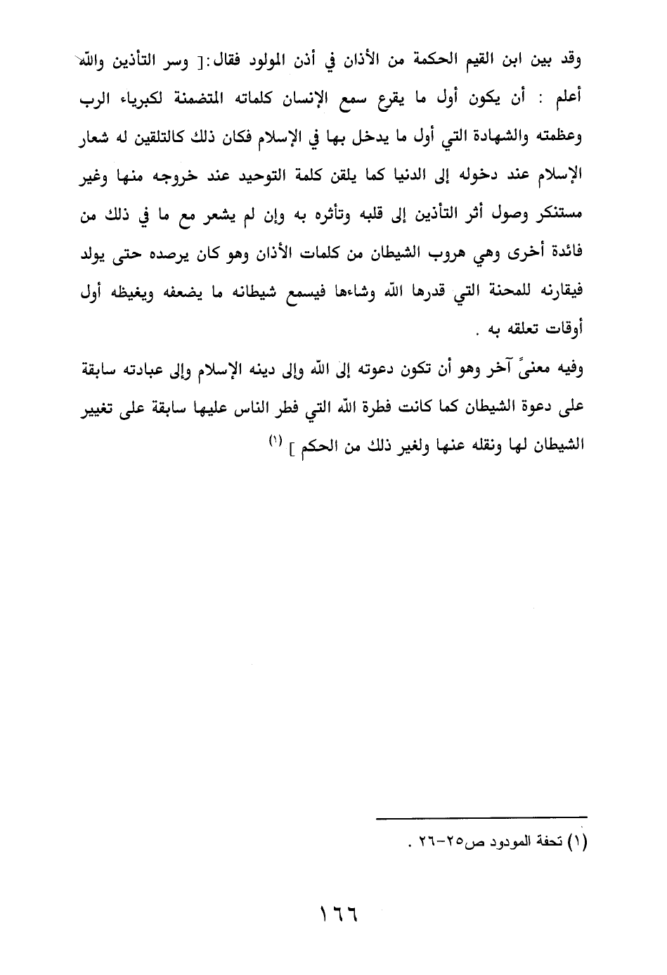 وقد بين ابن القيم الحكمة من الأذان في أذن المولود فقال: [وسر التأذين والله أعلم: أن يكون أول ما يقرع سمع الإنسان كلماته المتضمنة لكبرياء الرب وعظمته والشهادة التي أول ما يدخل بها في الإسلام فكان ذلك كالتلقين له شعار الإسلام عند دخوله إلى الدنيا كما يلقن كلمة التوحيد عند خروجه منها وغير مستنكر وصول أثر التأذين إلى قلبه وتأثره به وإن لم يشعر مع ما في ذلك من فائدة أخرى وهي هروب الشيطان من كلمات الأذان وهو كان يرصده حتى يولد فيقارنه للمحنة التي قدرها الله وشاءها فيسمع شيطانه ما يضعفه ويغيظه أول أوقات تعلقه به.
