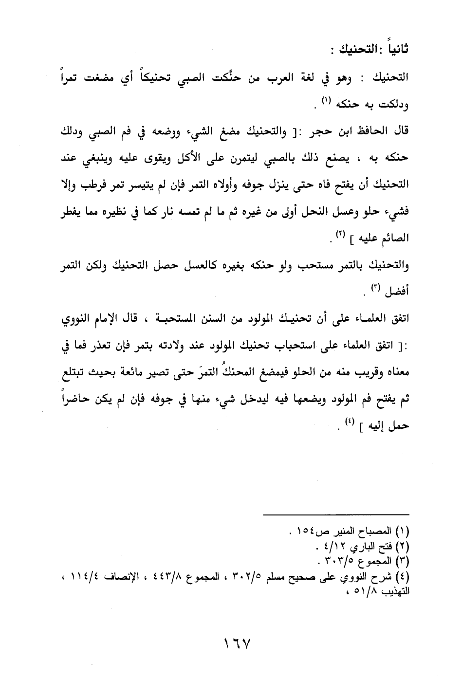 قال الحافظ ابن حجر: [والتحنيك مضغ الشيء ووضعه في فم الصبي ودلك حنكه به، يصنع ذلك بالصبي ليتمرن على الأكل ويقوى عليه وينبغي عند التحنيك أن يفتح فاه حتى ينزل جوفه وأولاه التمر فإن لم يتيسر تمر فرطب وإلا فشيء حلو وعسل النحل أولى من غيره ثم ما لم تمسه نار كما في نظيره مما يفطر الصائم عليه] (¬2).