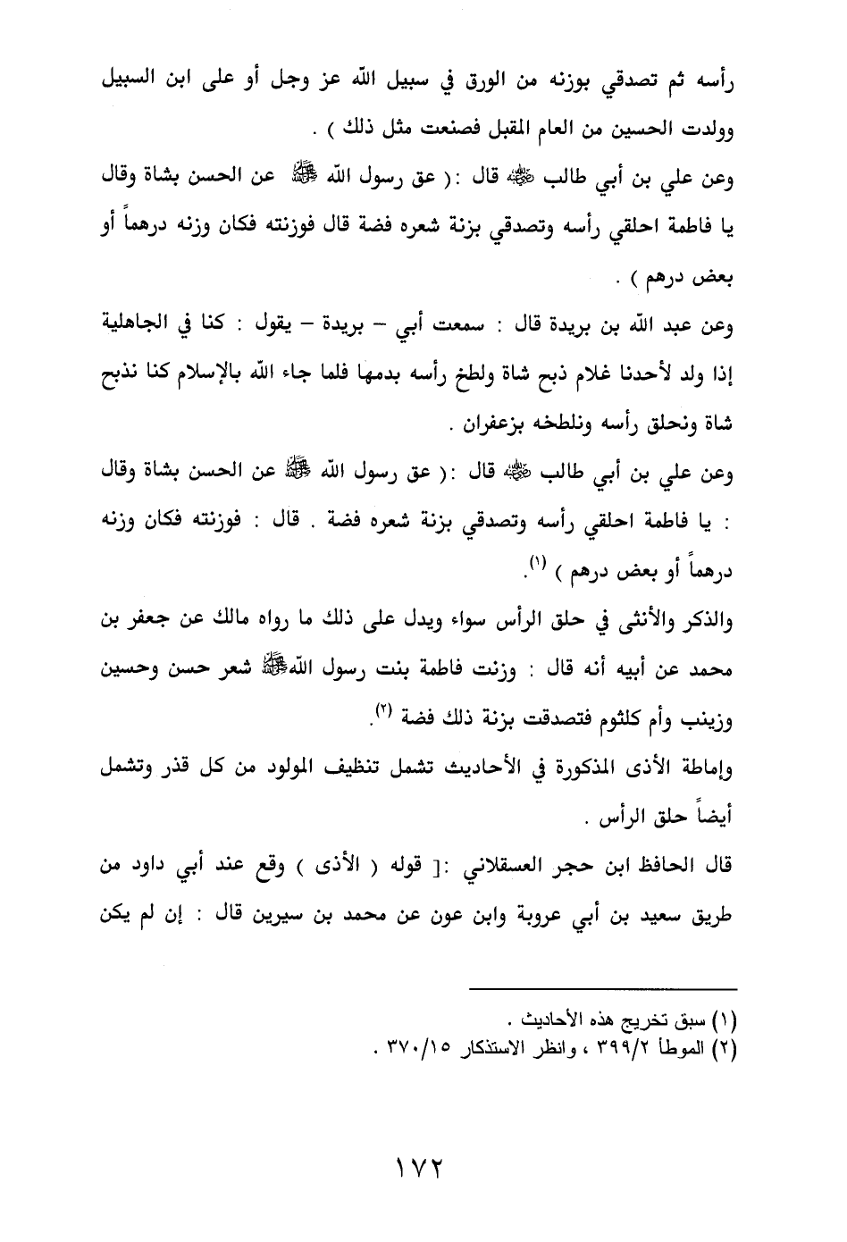 وعن علي بن أبي طالب - رضي الله عنه - قال: (عق رسول الله - صلى الله عليه وسلم - عن الحسن بشاة وقال يا فاطمة احلقي رأسه وتصدقي بزنة شعره فضة قال فوزنته فكان وزنه درهماً أو بعض درهم).