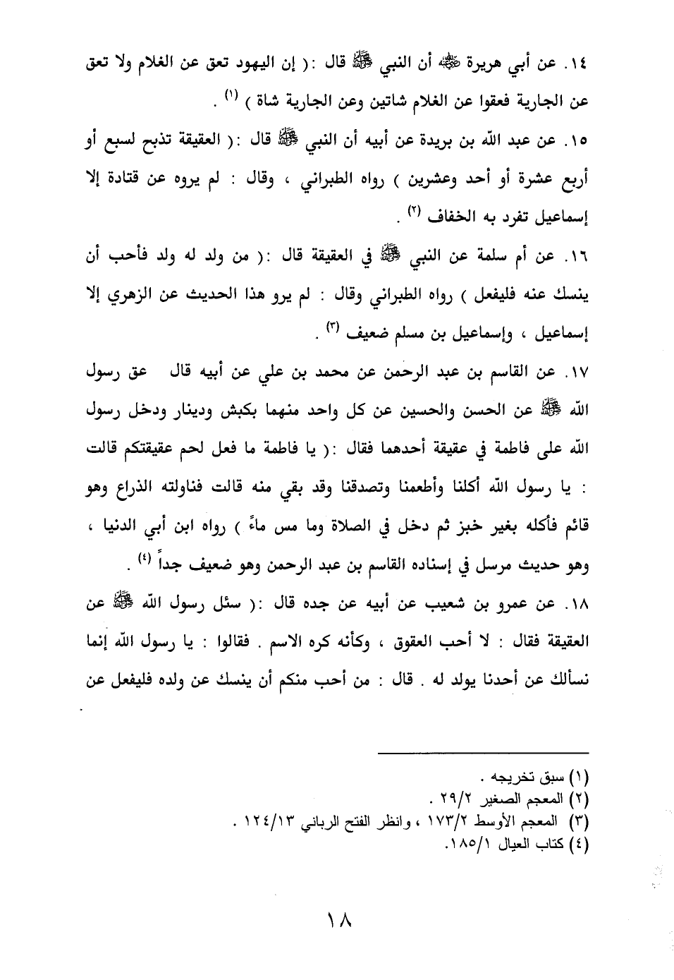 18. عن عمرو بن شعيب عن أبيه عن جده قال: (سئل رسول الله - صلى الله عليه وسلم - عن العقيقة فقال: لا أحب العقوق، وكأنه كره الاسم. فقالوا: يا رسول الله إنما نسألك عن أحدنا يولد له. قال: من أحب منكم أن ينسك عن ولده فليفعل عن