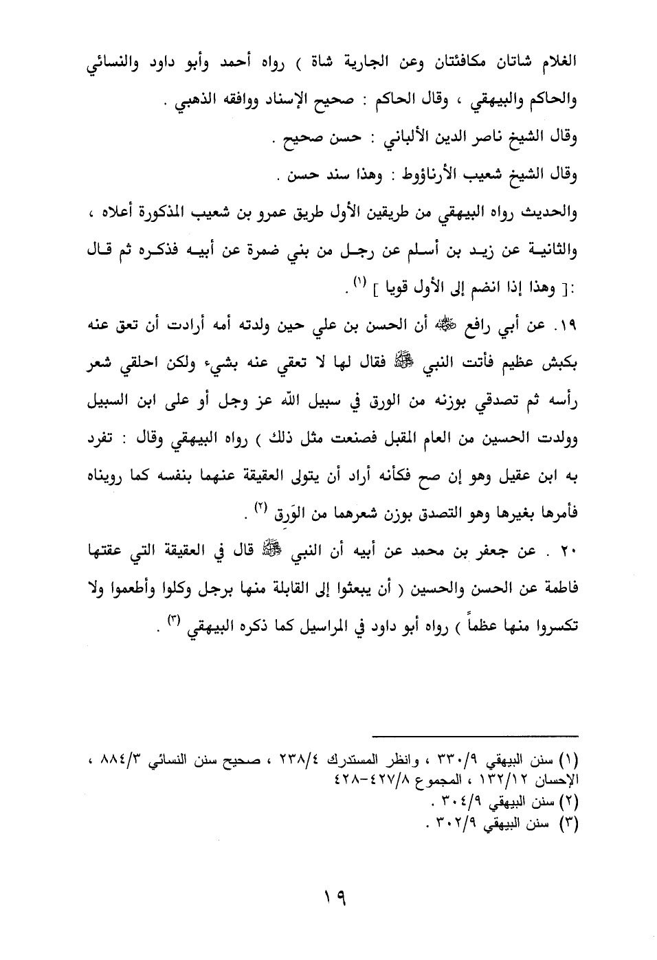19. عن أبي رافع - رضي الله عنه - أن الحسن بن علي حين ولدته أمه أرادت أن تعق عنه بكبش عظيم فأتت النبي - صلى الله عليه وسلم - فقال لها لا تعقي عنه بشيء ولكن احلقي شعر رأسه ثم تصدقي بوزنه من الورق في سبيل الله عز وجل أو على ابن السبيل وولدت الحسين من العام المقبل فصنعت مثل ذلك) رواه البيهقي وقال: تفرد به ابن عقيل وهو إن صح فكأنه أراد أن يتولى العقيقة عنهما بنفسه كما رويناه فأمرها بغيرها وهو التصدق بوزن شعرهما من الوَرِق (¬2).