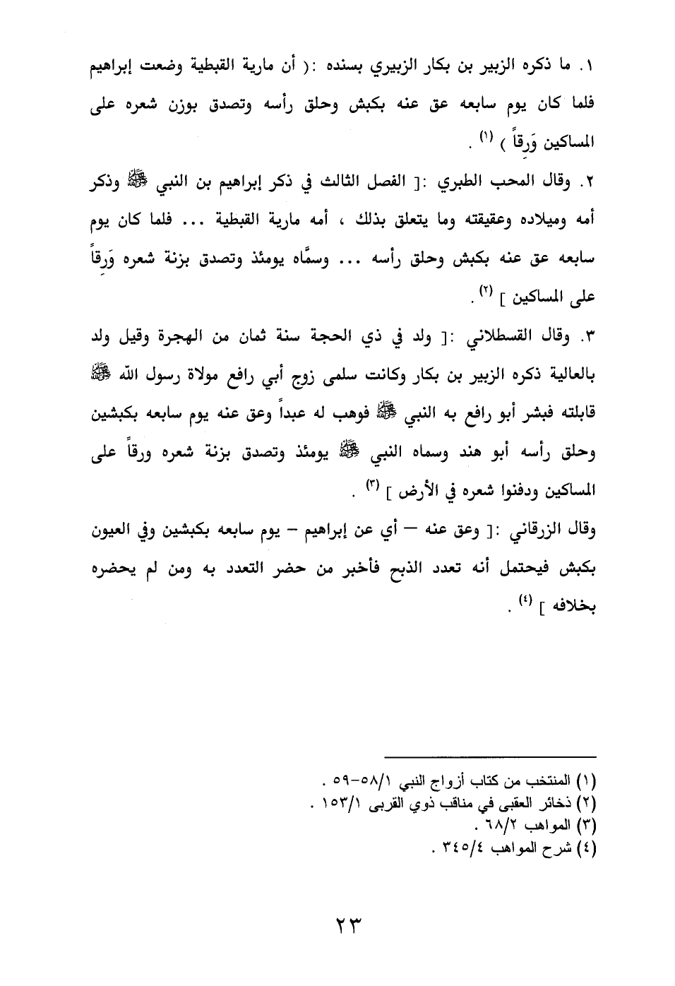 2. وقال المحب الطبري: [الفصل الثالث في ذكر إبراهيم بن النبي - صلى الله عليه وسلم - وذكر أمه وميلاده وعقيقته وما يتعلق بذلك، أمه مارية القبطية ... فلما كان يوم سابعه عق عنه بكبش وحلق رأسه ... وسمَّاه يومئذ وتصدق بزنة شعره وَرِقاً على المساكين] (¬2).