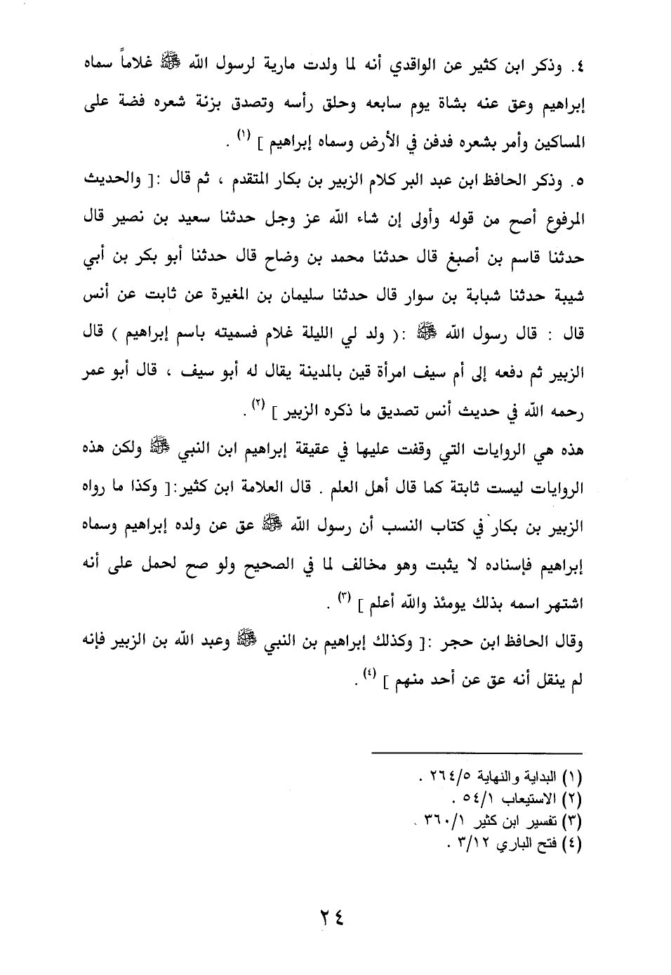 هذه هي الروايات التي وقفت عليها في عقيقة إبراهيم ابن النبي - صلى الله عليه وسلم - ولكن هذه الروايات ليست ثابتة كما قال أهل العلم. قال العلامة ابن كثير: [وكذا ما رواه الزبير بن بكار في كتاب النسب أن رسول الله - صلى الله عليه وسلم - عق عن ولده إبراهيم وسماه إبراهيم فإسناده لا يثبت وهو مخالف لما في الصحيح ولو صح لحمل على أنه اشتهر اسمه بذلك يومئذ والله أعلم] (¬3).