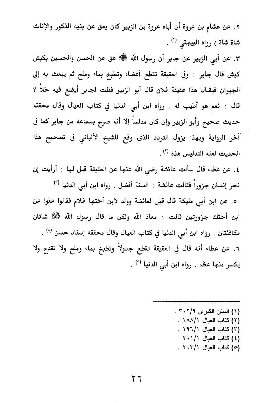 5. عن ابن أبي مليكة قال قيل لعائشة وولد لابن أختها غلام فقالوا عقوا عن ابن أختك جزورتين قالت: معاذ الله ولكن ما قال رسول الله - صلى الله عليه وسلم - شاتان مكافئتان. رواه ابن أبي الدنيا في كتاب العيال وقال محققه إسناد حسن (¬4).