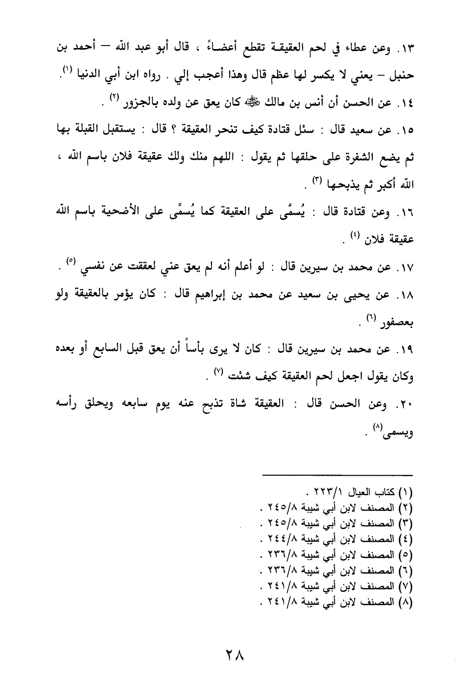 19. عن محمد بن سيرين قال: كان لا يرى بأساً أن يعق قبل السابع أو بعده وكان يقول اجعل لحم العقيقة كيف شئت (¬7).