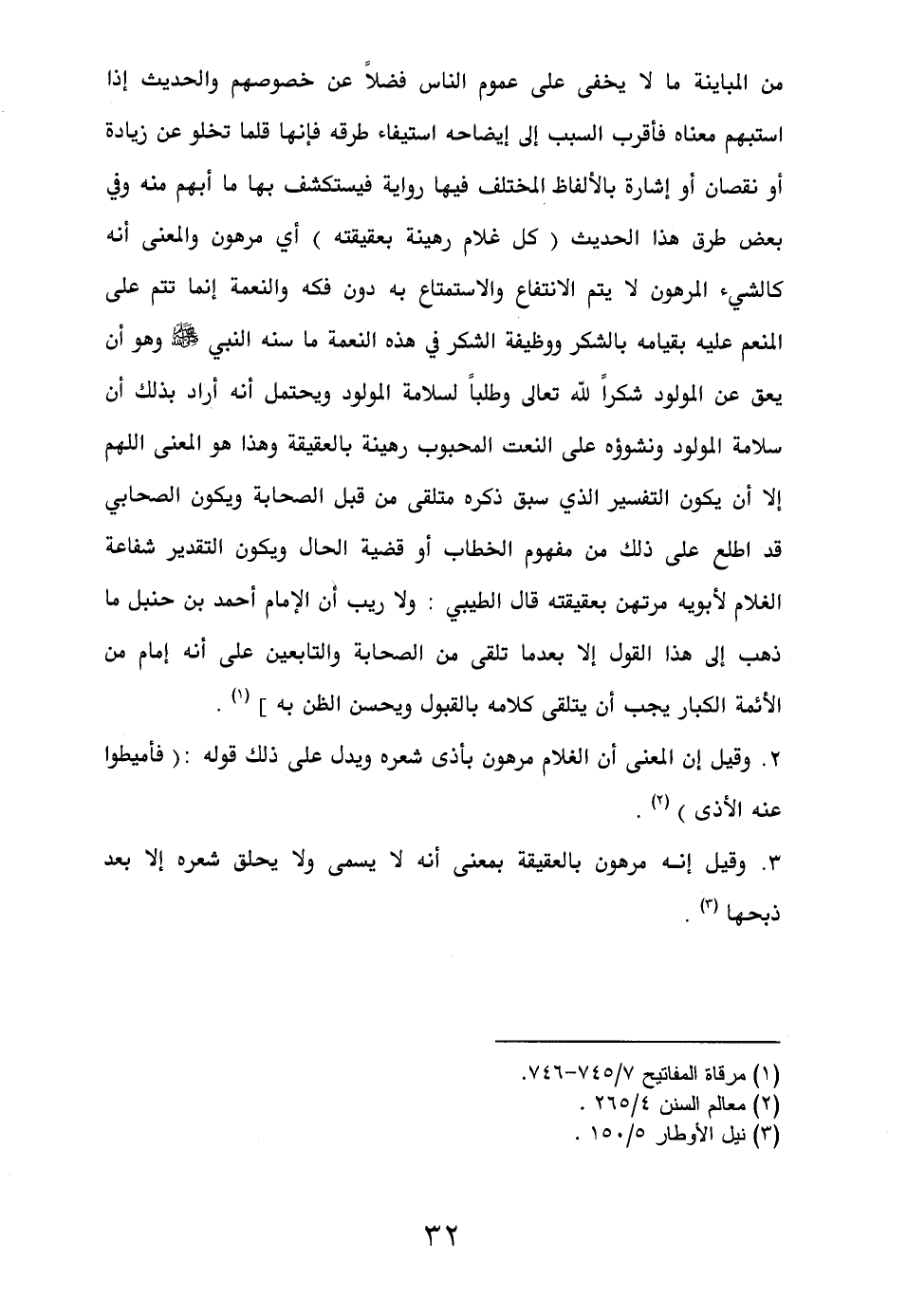 2. وقيل إن المعنى أن الغلام مرهون بأذى شعره ويدل على ذلك قوله: (فأميطوا عنه الأذى) (¬2).