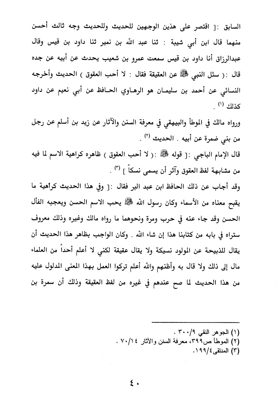 وقد أجاب عن ذلك الحافظ ابن عبد البر فقال: [وفي هذا الحديث كراهية ما يقبح معناه من الأسماء وكان رسول الله - صلى الله عليه وسلم - يحب الاسم الحسن ويعجبه الفأل الحسن وقد جاء عنه في حرب ومرة ونحوهما ما رواه مالك وغيره وذلك معروف ستراه في بابه من كتابنا هذا إن شاء الله. وكان الواجب بظاهر هذا الحديث أن يقال للذبيحة عن المولود نسيكة ولا يقال عقيقة لكني لا أعلم أحداً من العلماء مال إلى ذلك ولا قال به وأظنهم والله أعلم تركوا العمل بهذا المعنى المدلول عليه من هذا الحديث لما صح عندهم في غيره من لفظ العقيقة وذلك أن سمرة بن