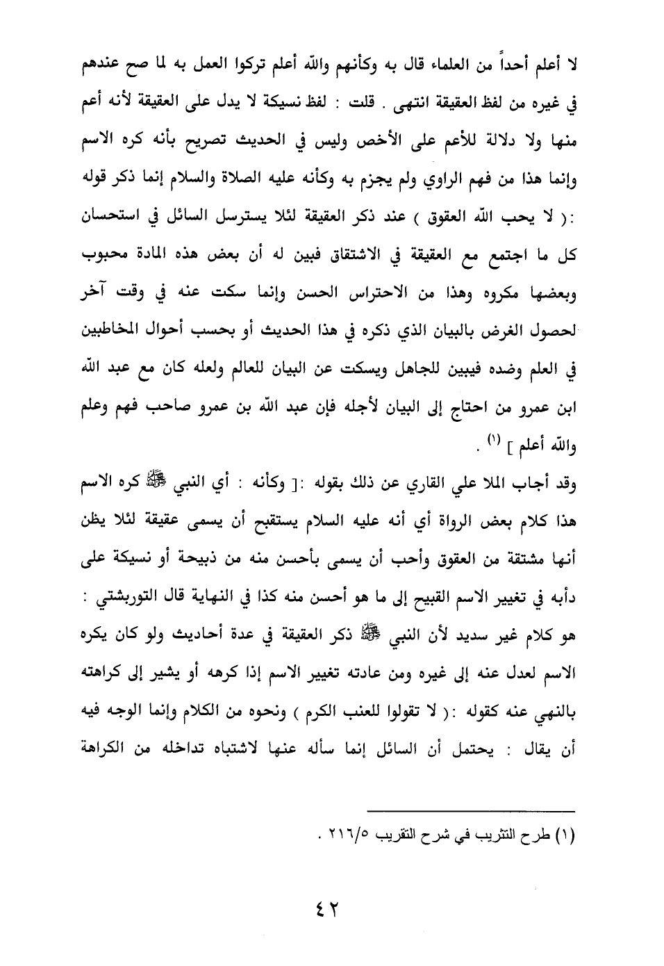 لا أعلم أحداً من العلماء قال به وكأنهم والله أعلم تركوا العمل به لما صح عندهم في غيره من لفظ العقيقة انتهى. قلت: لفظ نسيكة لا يدل على العقيقة لأنه أعم منها ولا دلالة للأعم على الأخص وليس في الحديث تصريح بأنه كره الاسم وإنما هذا من فهم الراوي ولم يجزم به وكأنه عليه الصلاة والسلام إنما ذكر قوله: (لا يحب الله العقوق) عند ذكر العقيقة لئلا يسترسل السائل في استحسان كل ما اجتمع مع العقيقة في الاشتقاق فبين له أن بعض هذه المادة محبوب وبعضها مكروه وهذا من الاحتراس الحسن وإنما سكت عنه في وقت آخر لحصول الغرض بالبيان الذي ذكره في هذا الحديث أو بحسب أحوال المخاطبين في العلم وضده فيبين للجاهل ويسكت عن البيان للعالم ولعله كان مع عبد الله ابن عمرو من احتاج إلى البيان لأجله فإن عبد الله بن عمرو صاحب فهم وعلم والله أعلم] (¬1).