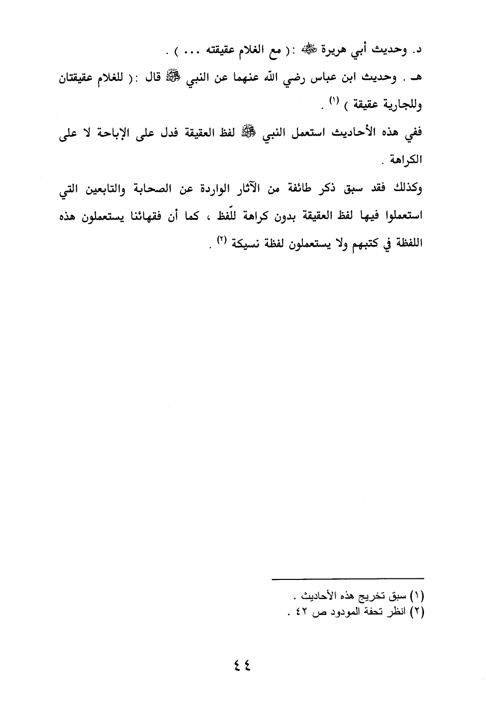 وكذلك فقد سبق ذكر طائفة من الآثار الواردة عن الصحابة والتابعين التي استعملوا فيها لفظ العقيقة بدون كراهة للّفظ، كما أن فقهائنا يستعملون هذه اللفظة في كتبهم ولا يستعملون لفظة نسيكة (¬2).
