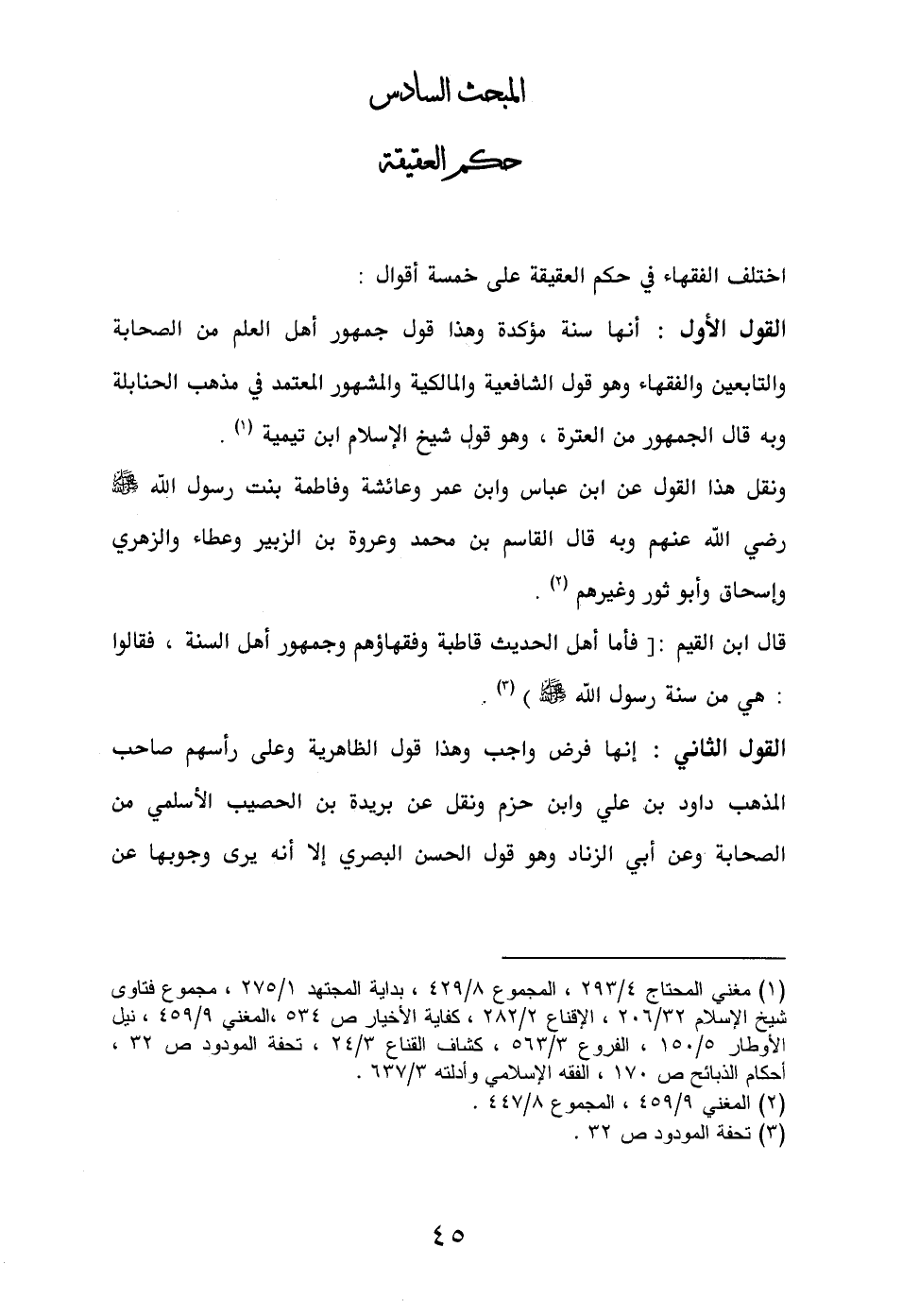 (¬1) مغني المحتاج 4/ 293، المجموع 8/ 429، بداية المجتهد 1/ 275، مجموع فتاوى شيخ الإسلام 32/ 206، الإقناع 2/ 282، كفاية الأخيار ص 534 ,المغني 9/ 459، نيل الأوطار 5/ 150، الفروع 3/ 563، كشاف القناع 3/ 24، تحفة المودود ص 32، أحكام الذبائح ص 170، الفقه الإسلامي وأدلته 3/ 637.