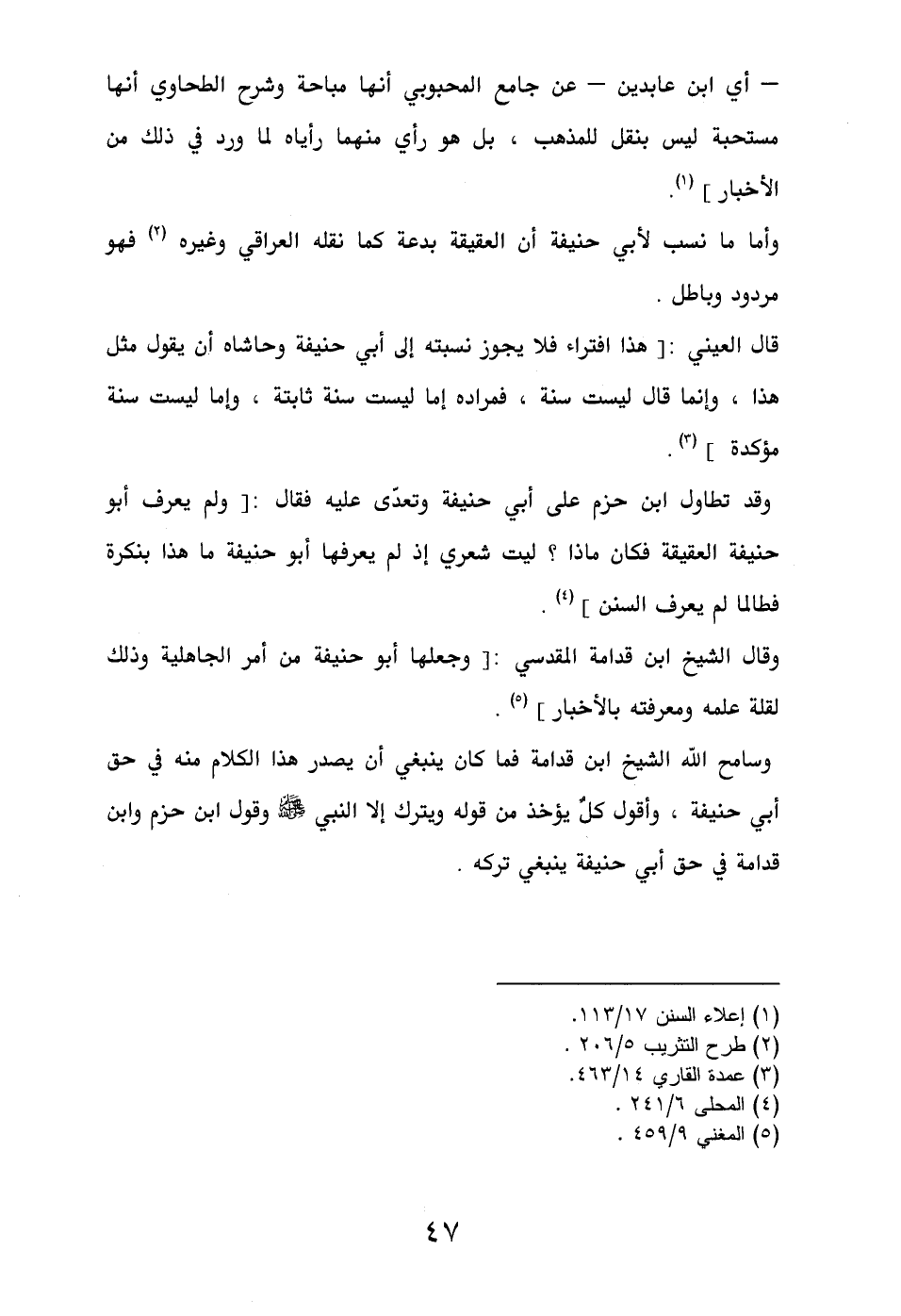 قال العيني: [هذا افتراء فلا يجوز نسبته إلى أبي حنيفة وحاشاه أن يقول مثل هذا، وإنما قال ليست سنة، فمراده إما ليست سنة ثابتة، وإما ليست سنة مؤكدة] (¬3).
