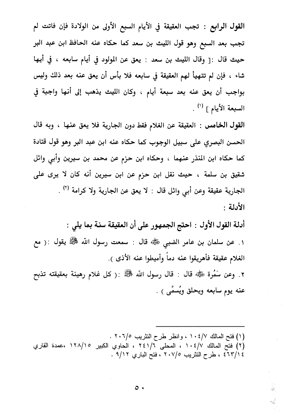 القول الرابع: تجب العقيقة في الأيام السبع الأولى من الولادة فإن فاتت لم تجب بعد السبع وهو قول الليث بن سعد كما حكاه عنه الحافظ ابن عبد البر حيث قال: [وقال الليث بن سعد: يعق عن المولود في أيام سابعه، في أيها شاء، فإن لم تتهيأ لهم العقيقة في سابعه فلا بأس أن يعق عنه بعد ذلك وليس بواجب أن يعق عنه بعد سبعة أيام، وكان الليث يذهب إلى أنها واجبة في السبعة الأيام] (¬1).