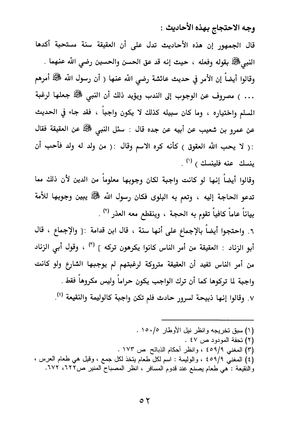 6. واحتجوا أيضاً بالإجماع على أنها سنة، قال ابن قدامة: [والإجماع، قال أبو الزناد: العقيقة من أمر الناس كانوا يكرهون تركه] (¬3)، وقول أبي الزناد من أمر الناس تفيد أن العقيقة متروكة لرغبتهم لم يوجبها الشارع ولو كانت واجبة لما تركوها كما أن ترك الواجب يكون حراماً وليس مكروهاً فقط.