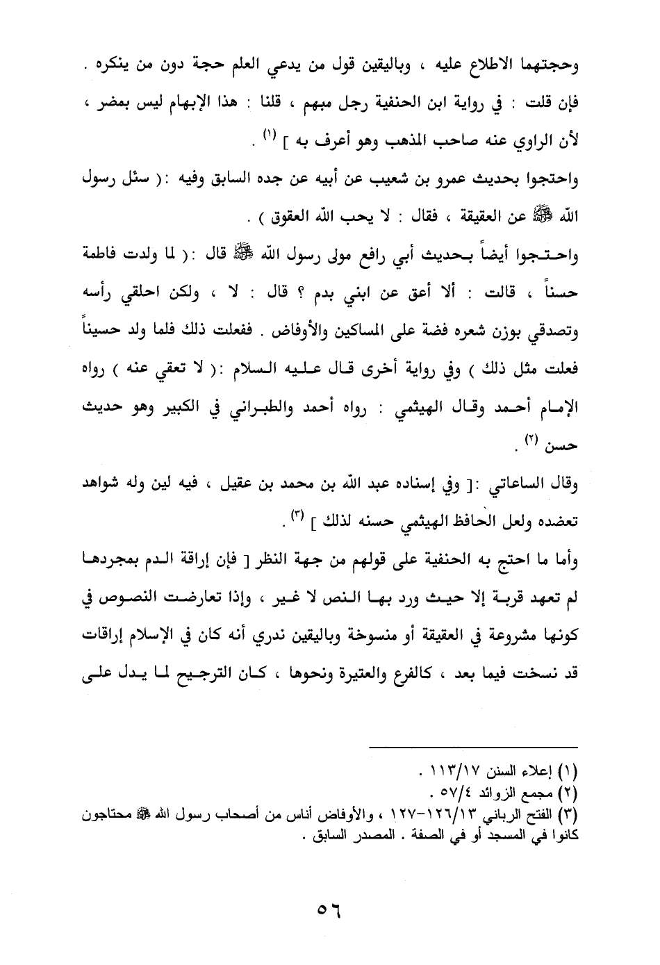 واحتجوا أيضاً بحديث أبي رافع مولى رسول الله - صلى الله عليه وسلم - قال: (لما ولدت فاطمة حسناً، قالت: ألا أعق عن ابني بدم؟ قال: لا، ولكن احلقي رأسه وتصدقي بوزن شعره فضة على المساكين والأوفاض. ففعلت ذلك فلما ولد حسيناً فعلت مثل ذلك) وفي رواية أخرى قال عليه السلام: (لا تعقي عنه) رواه الإمام أحمد وقال الهيثمي: رواه أحمد والطبراني في الكبير وهو حديث حسن (¬2).