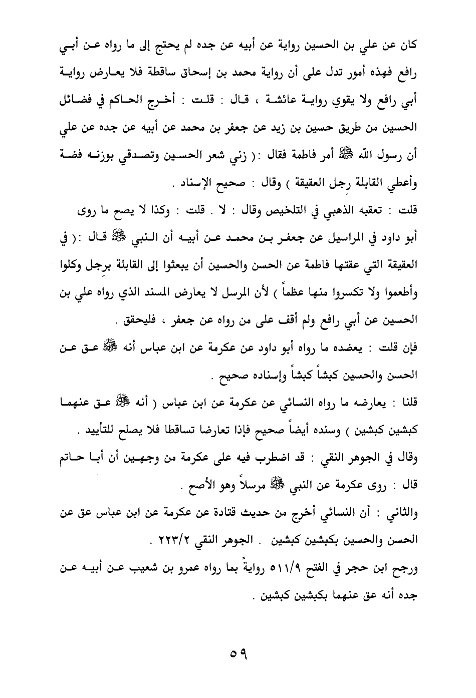 كان عن علي بن الحسين رواية عن أبيه عن جده لم يحتج إلى ما رواه عن أبي رافع فهذه أمور تدل على أن رواية محمد بن إسحاق ساقطة فلا يعارض رواية أبي رافع ولا يقوي رواية عائشة، قال: قلت: أخرج الحاكم في فضائل الحسين من طريق حسين بن زيد عن جعفر بن محمد عن أبيه عن جده عن علي أن رسول الله - صلى الله عليه وسلم - أمر فاطمة فقال: (زني شعر الحسين وتصدقي بوزنه فضة وأعطي القابلة رِجل العقيقة) وقال: صحيح الإسناد.