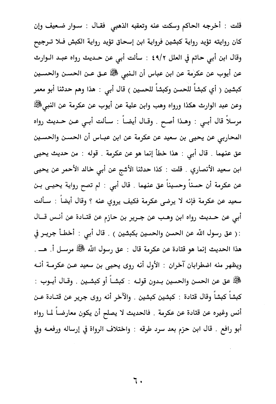 قلت: أخرجه الحاكم وسكت عنه وتعقبه الذهبي فقال: سوار ضعيف وإن كان روايته تؤيد رواية كبشين فرواية ابن إسحاق تؤيد رواية الكبش فلا ترجيح وقال ابن أبي حاتم في العلل 2/ 49: سألت أبي عن حديث رواه عبد الوارث عن أيوب عن عكرمة عن ابن عباس أن النبي - صلى الله عليه وسلم - عق عن الحسن والحسين كبشين (أي كبشاً للحسن وكبشاً للحسين) قال أبي: هذا وهم حدثنا أبو معمر وعن عبد الوارث هكذا ورواه وهب وابن علية عن أيوب عن عكرمة عن النبي - صلى الله عليه وسلم - مرسلاً قال أبي: وهذا أصح. وقال أيضاً: سألت أبي عن حديث رواه المحاربي عن يحيى بن سعيد عن عكرمة عن ابن عباس أن الحسن والحسين عق عنهما. قال أبي: هذا خطأ إنما هو عن عكرمة. قوله: من حديث يحيى ابن سعيد الأنصاري. قلت: كذا حدثنا الأشج عن أبي خالد الأحمر عن يحيى عن عكرمة أن حسناً وحسيناً عق عنهما. قال أبي: لم تصح رواية يحيى بن سعيد عن عكرمة فإنه لا يرضى عكرمة فكيف يروي عنه؟ وقال أيضاً: سألت أبي عن حديث رواه ابن وهب عن جرير بن حازم عن قتادة عن أنس قال: (عق رسول الله عن الحسن والحسين بكبشين). قال أبي: أخطأ جرير في هذا الحديث إنما هو قتادة عن عكرمة قال: عق رسول الله - صلى الله عليه وسلم - مرسل أ. هـ. ويظهر منه اضطرابان آخران: الأول أنه روى يحيى بن سعيد عن عكرمة أنه - صلى الله عليه وسلم - عق عن الحسن والحسين بدون قوله: كبشاً أو كبشين. وقال أيوب: كبشاً كبشاً وقال قتادة: كبشين كبشين. والآخر أنه روى جرير عن قتادة عن أنس وغيره عن قتادة عن عكرمة. فالحديث لا يصلح أن يكون معارضاً لما رواه أبو رافع. قال ابن حزم بعد سرد طرقه: واختلاف الرواة في إرساله ورفعه وفي