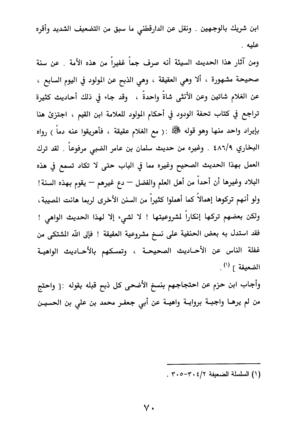 ومن آثار هذا الحديث السيئة أنه صرف جماً غفيراً من هذه الأمة. عن سنة صحيحة مشهورة، ألا وهي العقيقة، وهي الذبح عن المولود في اليوم السابع، عن الغلام شاتين وعن الأنثى شاةً واحدةً، وقد جاء في ذلك أحاديث كثيرة تراجع في كتاب تحفة الودود في أحكام المولود للعلامة ابن القيم، اجتزئ هنا بإيراد واحد منها وهو قوله - صلى الله عليه وسلم -: (مع الغلام عقيقة، فأهريقوا عنه دماً) رواه البخاري 9/ 486. وغيره من حديث سلمان بن عامر الضبي مرفوعاً. لقد ترك العمل بهذا الحديث الصحيح وغيره مما في الباب حتى لا تكاد تسمع في هذه البلاد وغيرها أن أحداً من أهل العلم والفضل – دع غيرهم – يقوم بهذه السنة! ولو أنهم تركوها إهمالاً كما أهملوا كثيراً من السنن الأخرى لربما هانت المصيبة، ولكن بعضهم تركها إنكاراً لمشروعيتها! لا لشيء إلا لهذا الحديث الواهي! فقد استدل به بعض الحنفية على نسخ مشروعية العقيقة! فإلى الله المشتكى من غفلة الناس عن الأحاديث الصحيحة، وتمسكهم بالأحاديث الواهية الضعيفة] (¬1).